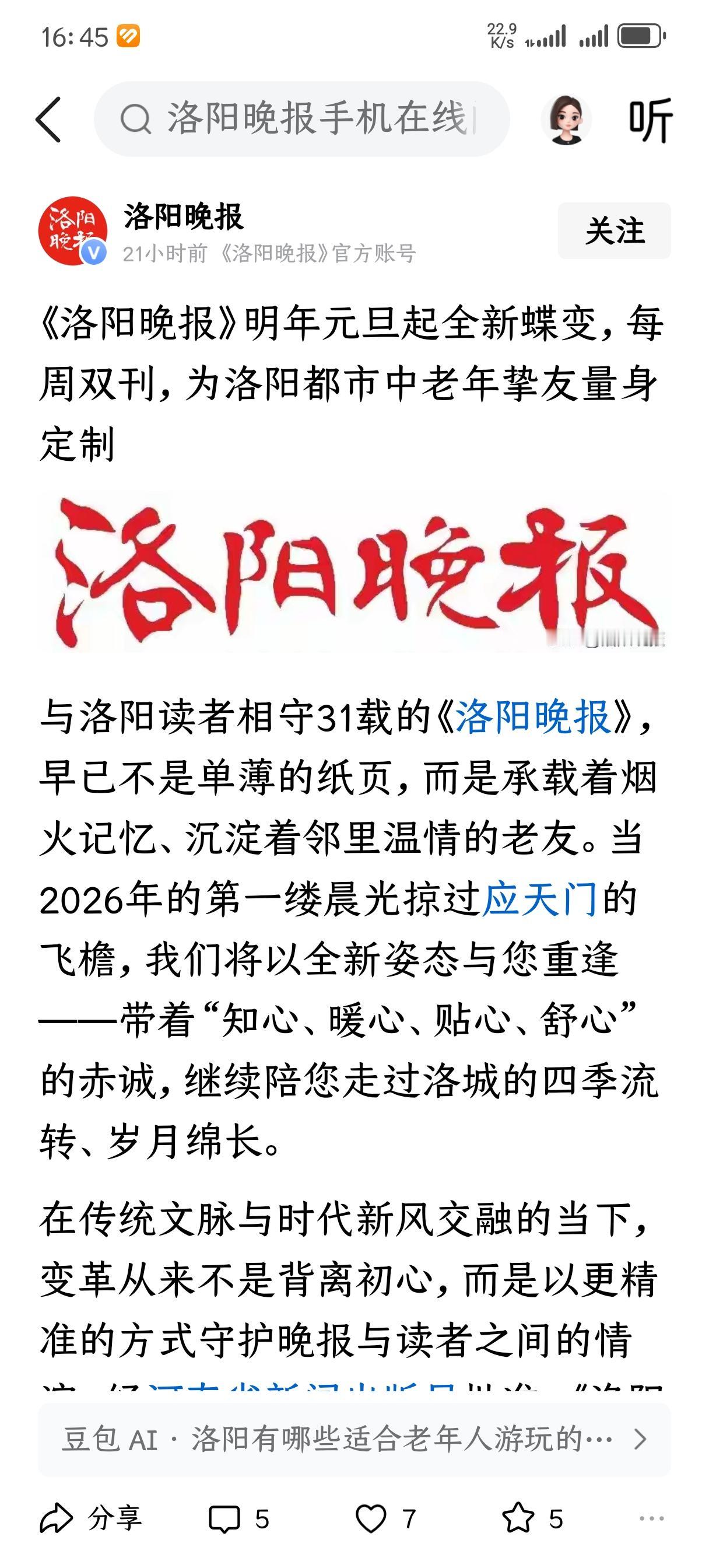 洛阳晚报压缩出版期数,由一周六期改为一周两期。 风靡洛阳几十年的洛阳晚报,风头正劲时,一周几乎六天每天都有刊中刊,比如,女周刊,生命周刊,教育周刊,旅游周刊,生活周刊,汽车周刊等。 那些年还读报,买报,洛阳晚报也是经常买的报纸。 洛阳晚报,曾经也是敢说的。 印象中,最厉害的一次报道,是一位卖枣不堪城管驱赶,一怒之下把一车枣撒入河中。 之后的洛阳晚报,歌功颂德多,批评报道少。 再之后,看报少,买报更少,买洛阳晚报就少之又少了。 今天,突然看到洛阳晚报发的信息,洛阳晚报,将变成一周两期,主要读者群设定为银发群体。 这一改变,我不是目标读者群,以后看晚报估计会更少了。
