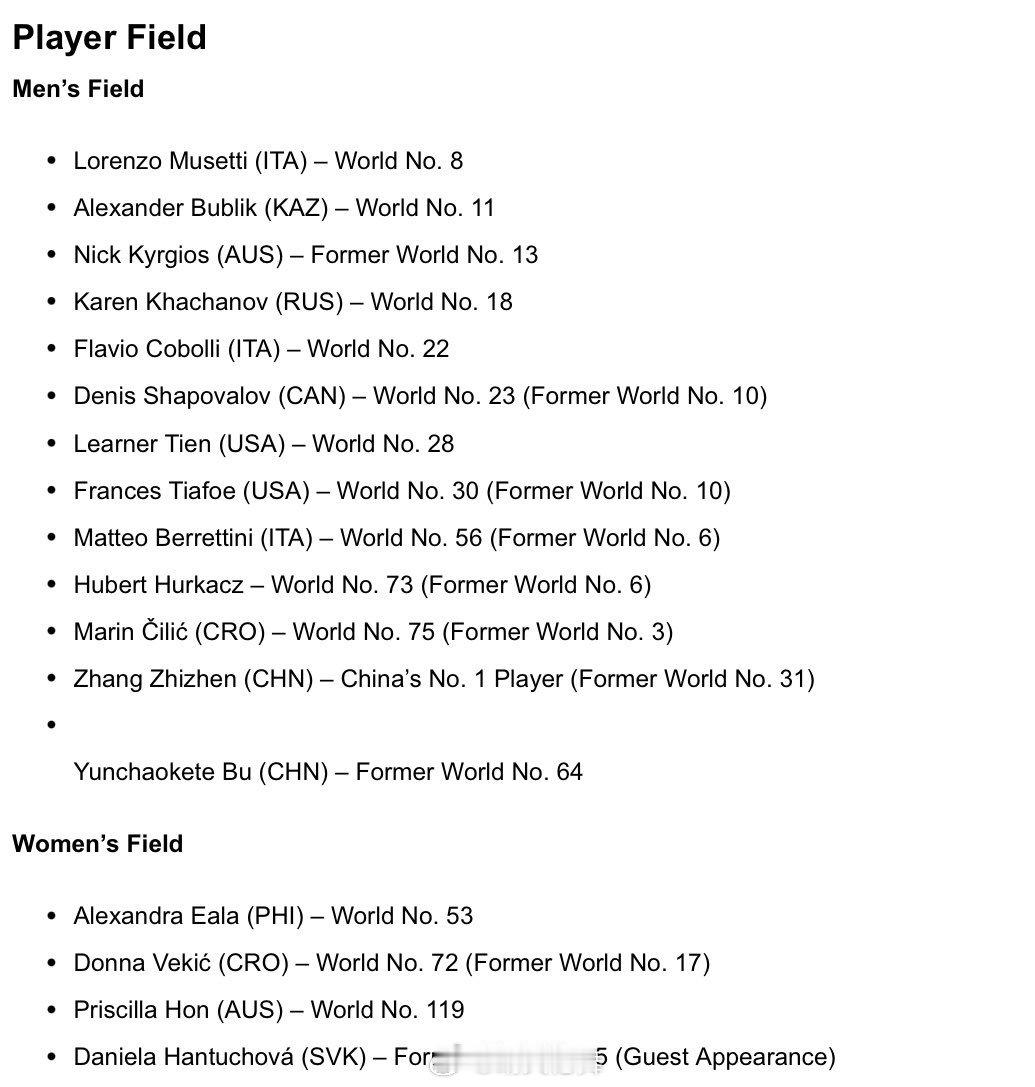 库扬精英赛全名单(1.13-1.15)男子:穆塞蒂🇮🇹布勃利克🇰🇿克耶高斯🇦🇺卡恰诺夫🇷🇺科博利🇮🇹沙波瓦洛夫🇨🇦勒纳-钱🇺🇸蒂亚福🇺🇸贝雷蒂尼🇮🇹胡尔卡奇🇵🇱西里奇🇭🇷张之臻🇨🇳布云朝克特🇨🇳女子:伊埃拉🇵🇭维基奇🇭🇷韩天遇🇦🇺汉图楚娃🇸🇰 网球talking大会