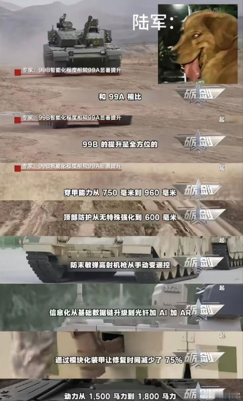 99B主战坦克焕然一新,七大改进全是革命性的,令解放军战力脱胎换骨!相较于上一代99A,99B并非简单升级,而是在七个关键维度实现了质的飞跃——每一项改进都直指未来高强度对抗环境下的真实需求。99B的主炮穿甲能力从99A时代的750毫米均质钢跃升至960毫米。这意味着在2000米距离上,它能有效击穿目前全球绝大多数现役主战坦克的正面装甲,包括M1A2 SEPv3和豹2A7的部分防护区域。其次,防护体系全面重构。过去99A对顶部攻击——尤其是末敏弹和巡飞弹——缺乏专门防御手段。99B则首次在车顶加装了等效600毫米均质钢的复合装甲层,并配合主动防护系统(APS)形成多层拦截网。第三项革命性改进在于遥控武器站。99B将原本需乘员探身操作的12.7毫米高射机枪,升级为全电控遥控武器站。车组无需暴露即可应对低空无人机、轻型直升机甚至步兵反坦克小组。这不仅大幅提升生存率,也契合“减少人员暴露、增强态势感知”的现代装甲作战原则。第四,信息化能力实现代际跨越。99A虽已配备数据链,但99B在此基础上整合了光纤高速通信网络、车载AI辅助决策系统以及AR(增强现实)头显。车长和炮手可通过AR界面实时叠加敌我位置、地形障碍、火力覆盖区等信息,AI还能自动识别目标优先级并建议交战方案。第五,模块化装甲设计带来后勤革命。99B采用可快速拆卸更换的模块化装甲单元,受损后修复时间比99A缩短75%。在高强度持续作战中,这意味着更多坦克能在数小时内重返战场。第六,动力系统从1500马力跃升至1800马力。别小看这300马力的提升——它不仅让58吨级的99B推重比突破31马力/吨,接近西方顶级主战坦克水平,更关键的是为未来加装激光武器、电磁装甲或更大功率电子设备预留了电力冗余。动力不仅是“跑得快”,更是“带得动未来”。最后,智能化程度的整体跃升贯穿上述所有改进。99B不再只是“有人驾驶的钢铁堡垒”,而是一个具备自主感知、智能决策、网络协同能力的陆战智能体。其车载计算机可实时分析战场数据流,与无人机、炮兵、步战车共享目标信息,真正实现“发现即摧毁”。