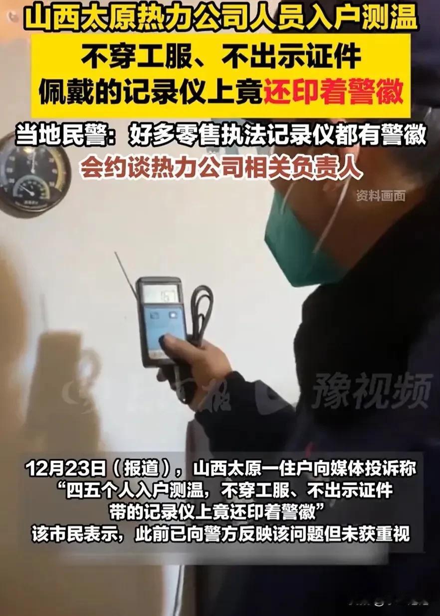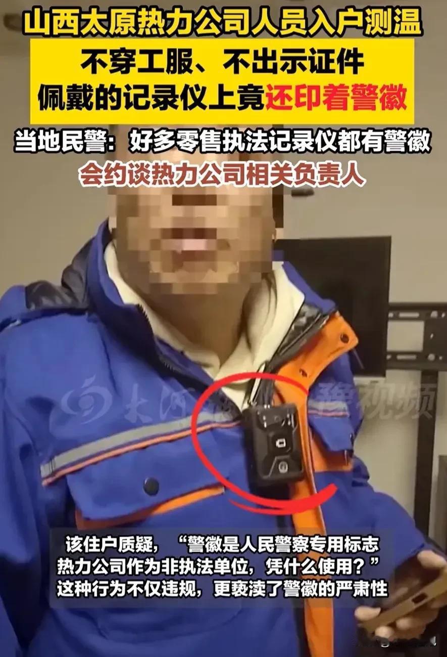 这下闹大了!山西太原一男子因家里温度低于18度向热力公司投诉,工作人员中午上门专测阳面房屋,男子质疑时还发现其佩戴的记录仪印有警徽,十分不解。 热力公司这波操作太迷了。住户暖气不热投诉,他们挑中午阳面测温,明摆着糊弄事。更过分的是用带警徽的记录仪,热力公司又不是执法单位,这不是明着误导人吗? 换成谁碰到这事能不气?暖气不热检测还搞小动作,带个警徽记录仪,任谁都会犯嘀咕。身边不少人也遇到过上门服务不出证件的,心里都没底。有人说热力公司是怕起冲突才带记录仪,但用警徽款就是不对,这是把警察权威当儿戏。 当地民警回应更让人意外,称好多零售记录仪都有警徽,不是警用的,还要约谈热力公司负责人。合着警徽是随便就能买的?老百姓看到警徽还以为是官方执法,结果是热力公司买的“山寨货”,这操作离谱到家了。 从法律上讲,警徽是人民警察专用标志,《人民警察法》《人民警察使用警械和武器条例》明确规定,任何单位和个人不得非法制造、贩卖、持有和使用警械装备及标志。热力公司作为企业,用带警徽的记录仪,已经涉嫌违规。这不仅亵渎了警徽的严肃性,还会让公众对执法标志产生混淆,影响社会秩序。 不管什么单位,上门服务都得守规矩。工服、证件该出示就出示,别搞这些违法又糊弄人的把戏。 目前当地警方已表态约谈热力公司,后续进展咱们也会持续关注。你遇到过这种不规范的上门服务吗?你觉得热力公司该怎么整改?