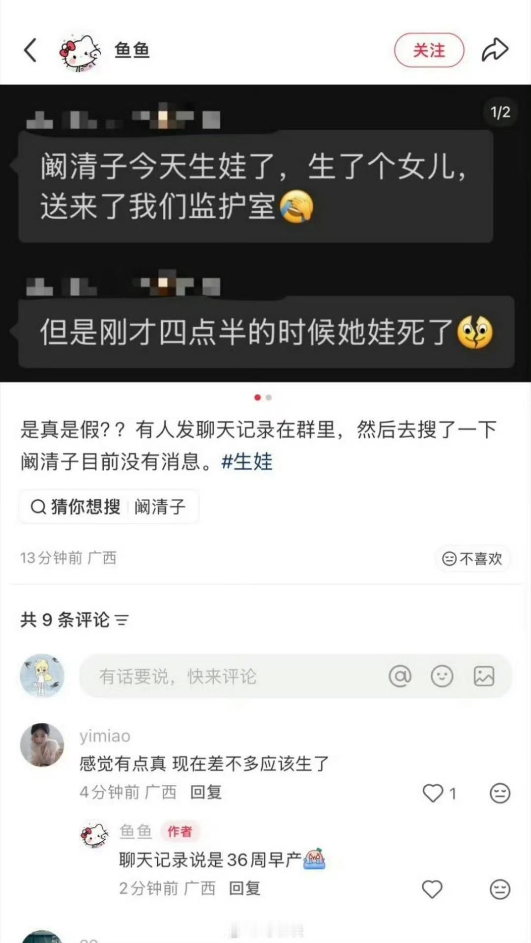太离谱了!女明星阚清子生娃,被有人爆料生下来早产36周,是个女儿,但在凌晨4点半的时候去世了。孩子没有肛门,也没有膀胱,尿管也插不进去 明明阚清子前几天还在发文给孩子买礼物,庆祝马上要出生了。而且现在科技这么发达,体检肯定能查出来是个有缺陷的孩子,不至于等到生下来才知道,感觉更像是谣言?大家觉得可能是真的吗