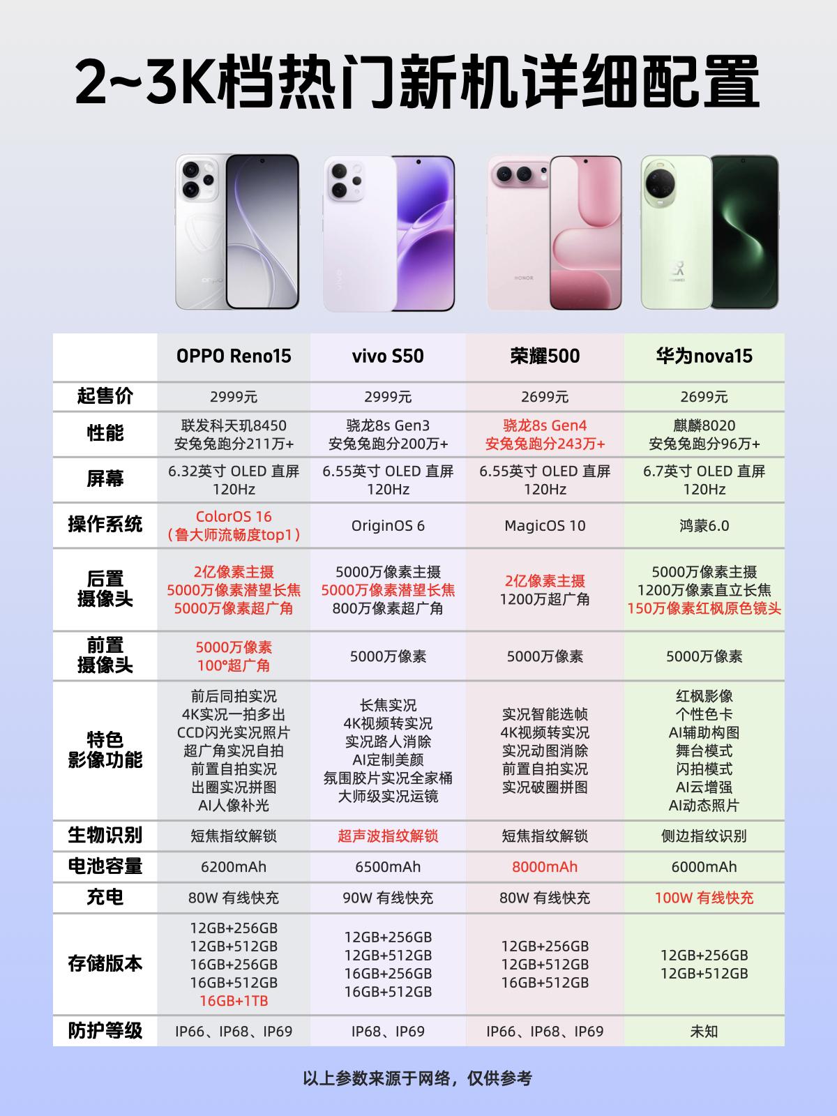 荣OV华 2~3K档热门新机性能天梯图!看看段位 2~3K档位,国产四款热门新机的性能天梯图,大家觉得靠不靠谱? 安兔兔跑分 📱荣耀500:骁龙8s Gen4,243万+分 📱OPPO Reno15 :天玑8450,211万+分 📱vivo S50:骁龙8s Gen3,200万+分 📱华为nova15:麒麟8020,96万+分 安兔兔跑分还是比较有参考性的,实际性能表现大差不差 不过日常体验不能光看跑分,系统流畅性也很重要 像华为nova15的鸿蒙6.0系统,流畅度这块是完全没问题的 OPPO Reno15的ColorOS16系统,机圈德芙的体验也不用担心 当然其它配置也不能落下,这几款机型的配置优势都蛮明显的! 像荣耀500的8000mAh大电池就很强,适合看重续航体验的入手; 华为则是有红枫原色镜头,拍照的话色彩表现会更有优势; vivo S50则是有潜望长焦镜头,拍远景、人像更舒服,可惜没有出圈实况拼图功能。 OPPO Reno15不仅有5000万潜望,还有2亿像素主摄和5000万超广角,影像配置更全面,而出圈实况拼图相比其他玩法更多。 要我选的话,我更看好OPPO Reno15一些 毕竟性能到位,系统流畅性也有优势 影像配置还很强,实况玩法还更多一些体验更全面点 大家觉得哪款更值得入手?