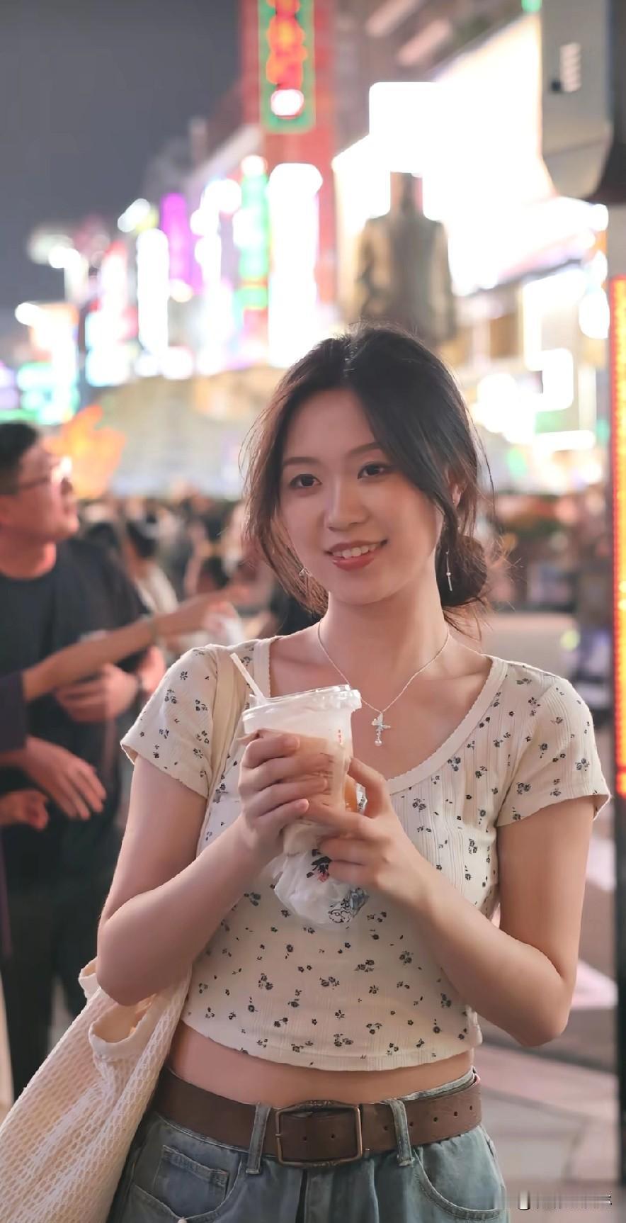 夜晚街头的甜美少女,手拿奶茶,微笑如花