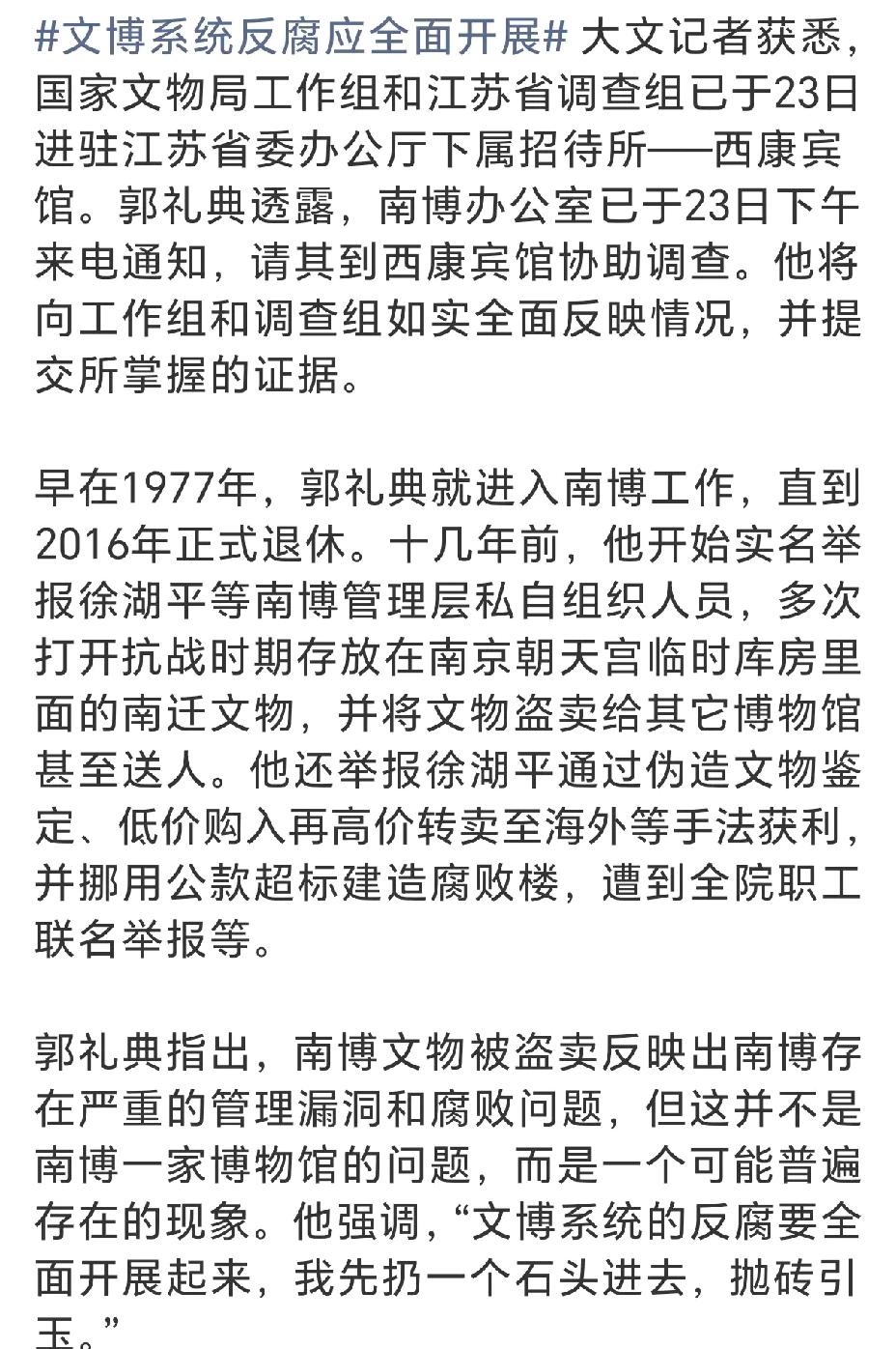 文物局专案组进驻南京办公,实名举报人郭礼典已经接到协助调查通知,可以说郭礼典现在