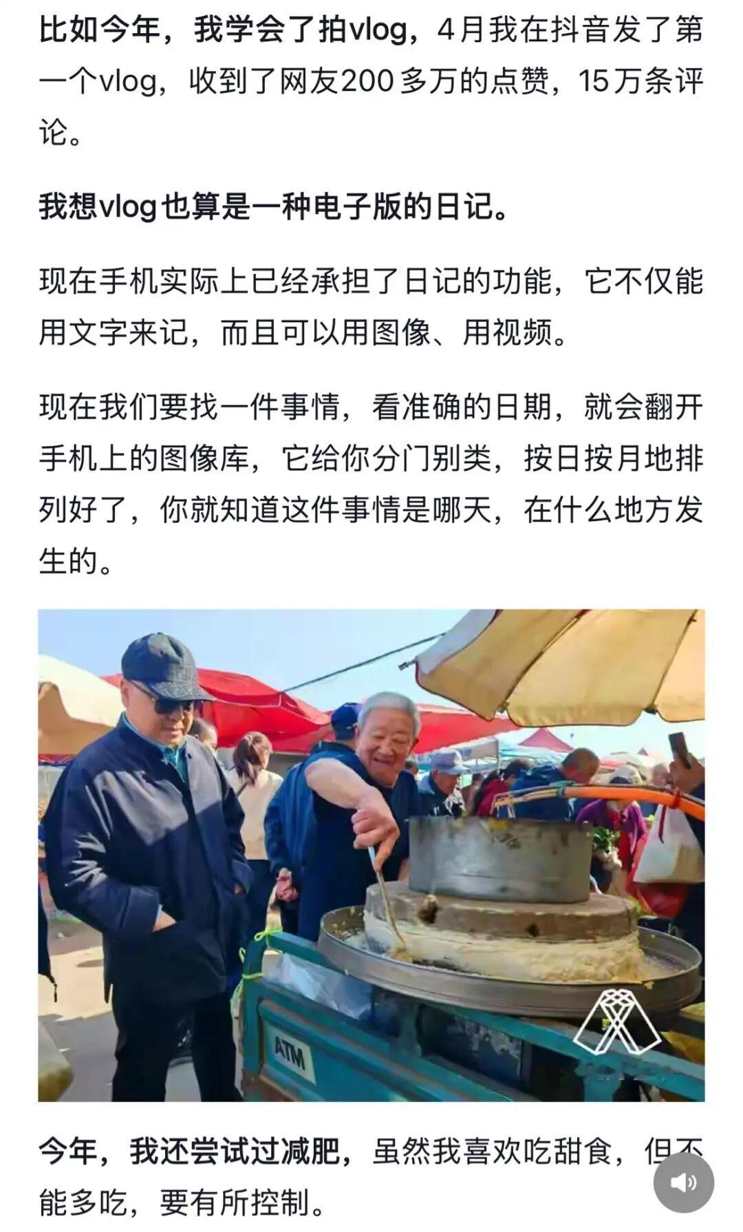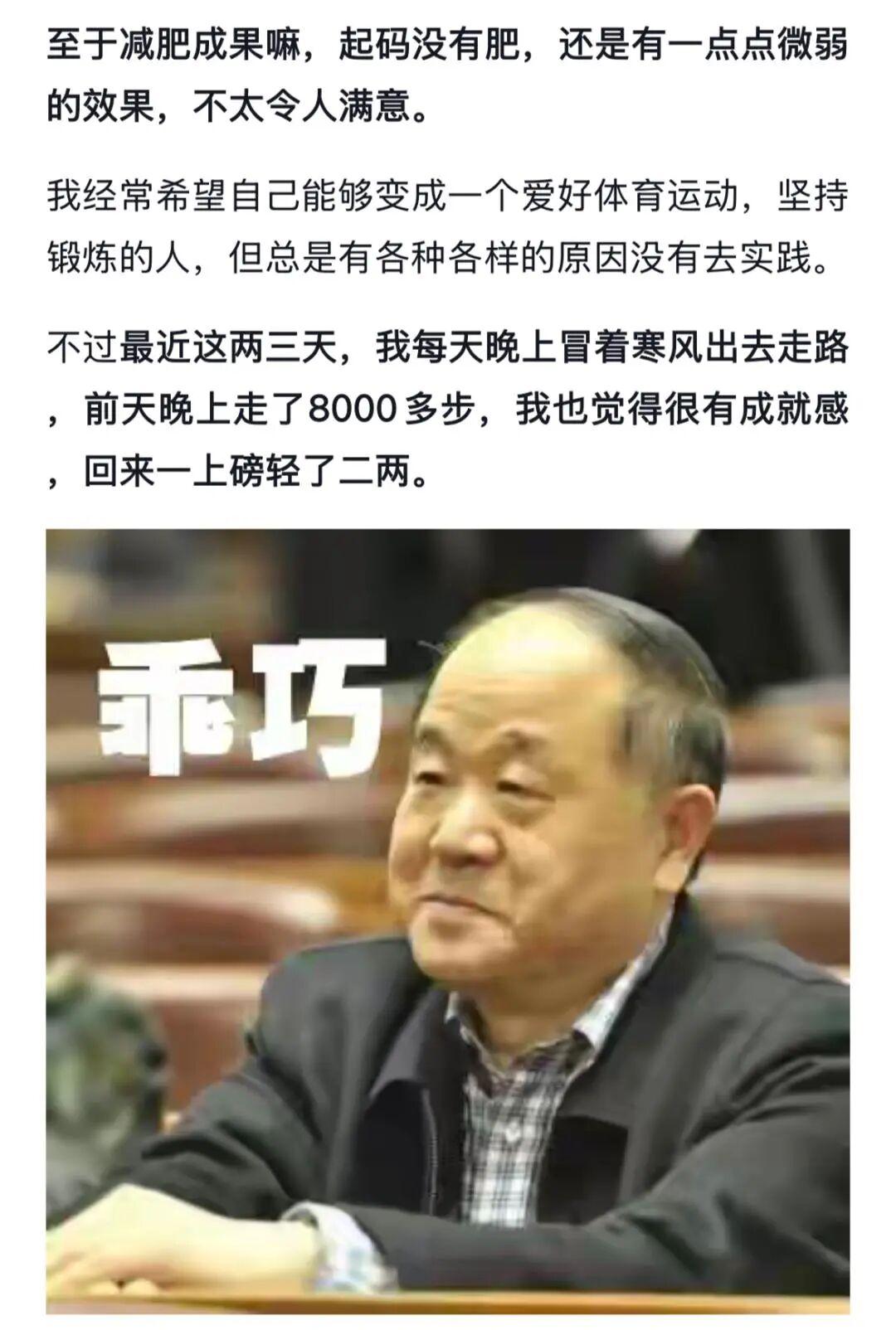 2025年临近尾声,诺贝尔文学奖得主莫言在社交平台晒出个人年终总结,其中“不太满意今年的减肥效果”这句表述,瞬间拉近了与网友的距离,引发广泛共鸣。 今年70岁的莫言,在总结里坦言这是特别的一年,但自己并不觉得年迈。除了文学创作相关的思考,他还分享了很多生活化的点滴,减肥便是其中之一。他提到自己喜欢吃甜食,但为了健康会刻意控制,尝试减肥后“起码没有肥,还有一点点微弱的效果”,言语间满是可爱的自嘲。不过老爷子也有小成就,前几日每晚冒着寒风步行锻炼,还达成了单日八千步的目标,体重轻了二两,这份坚持让他倍感自豪。 值得关注的是,这位文坛巨匠还紧跟年轻潮流,今年首次尝试拍摄vlog记录日常。4月他在抖音发布的首条vlog,便斩获200多万点赞和15万条评论。他还风趣地将vlog比作“电子版日记”,称手机如今已成为自己记录生活的重要工具。 总结里,莫言还分享了个人阅读心得,提到今年最爱的书籍是契诃夫的《萨哈林岛游记》。同时,他也介绍了公益项目“与莫言同行”的成果:该项目已吸引超40万人参与捐赠,帮扶了数千个孤独症家庭,甚至获得世界卫生组织的关注,这份满满的善意令人动容。 这份没有宏大叙事、满是生活烟火气的年终总结一经发布,便引发网友热烈留言互动。不少人自嘲“今年和莫言老师唯一的共同点,就是减肥计划没达标”。不得不说,70岁的莫言依旧保持着对生活的热忱与好奇心,这般接地气的模样,着实让人喜爱。