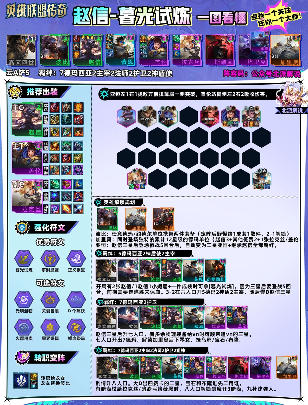 构筑开5德玛+泰坦开2主宰2神盾,赵信三星+低费德玛全二+一张盖伦/拉克丝可解锁加里奥。