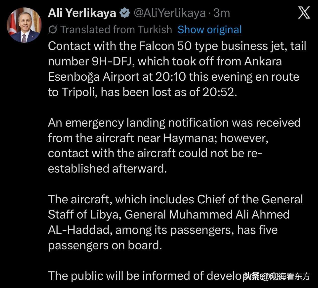 快讯:土耳其内政部长证实~载有利比亚陆军总参谋长的飞机失去联系!