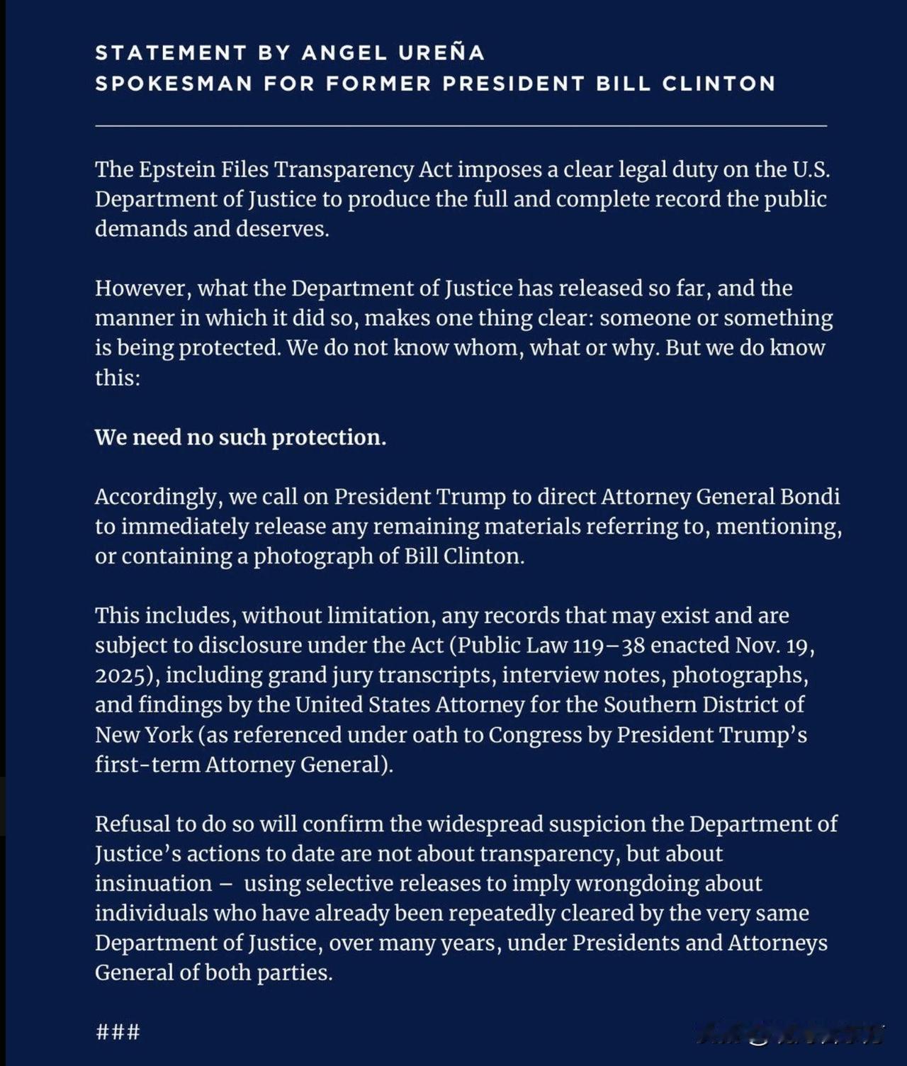 快讯:美国前总统比尔·克林顿的发言人发公告,要求美国司法部和特朗普尽快公布“剩余的没有公布的爱泼斯坦文件”,并且强调:不需要所谓的保护!