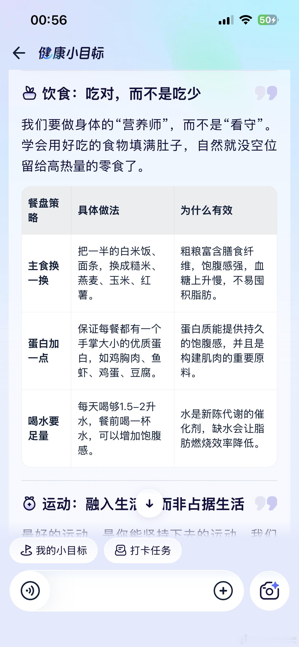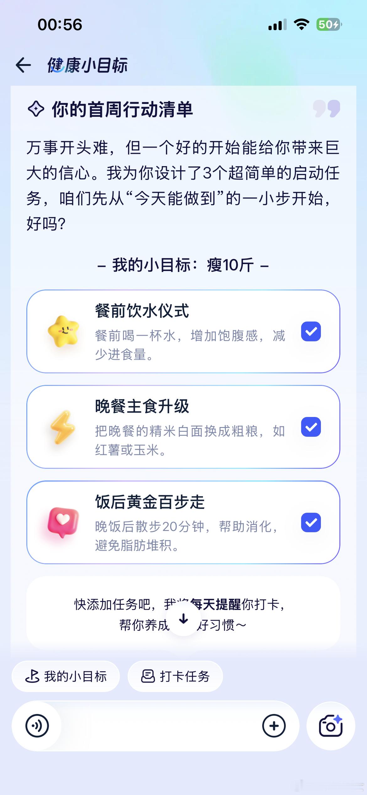颜如晶的24小时AI私教有多香减脂卡平台期真的太磨人了,心态分分钟要崩,直到用了蚂蚁阿福才懂颜如晶说的AI私教有多香!对着它设置了瘦10斤的小目标,立马生成专属减重计划,从能量缺口的底层逻辑,到鸡胸肉替换、杂粮饭搭配的饮食技巧,再到通勤拉伸、睡前燃脂的生活化运动建议,全是科学又好落地的方法。每天还有餐前饮水、饭后散步的打卡提醒,像耐心教练推着你走,运动前会预警膝盖发力风险,练完还能查肌肉放松攻略。不用出门、不用约课,随时调整计划,这个AI搭子,减脂人真的离不开!