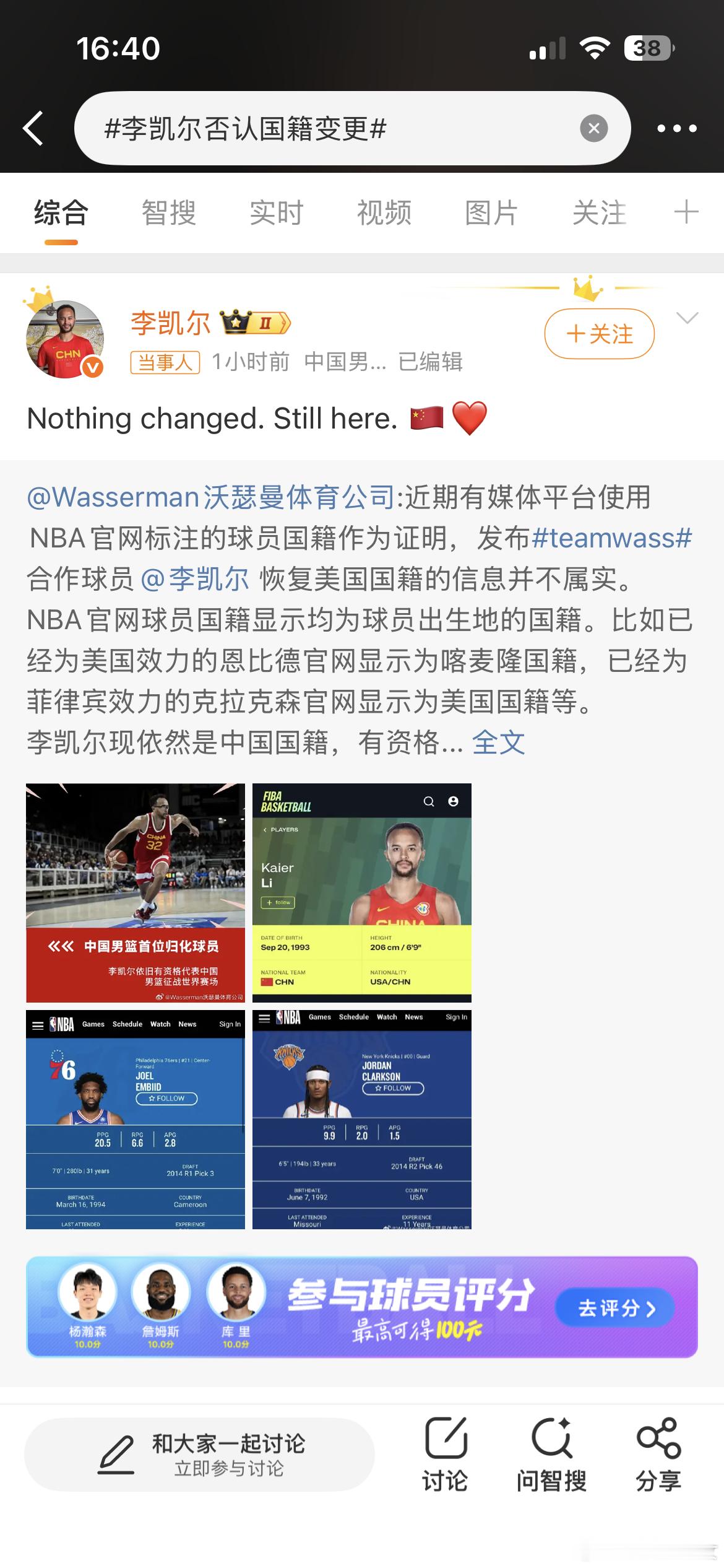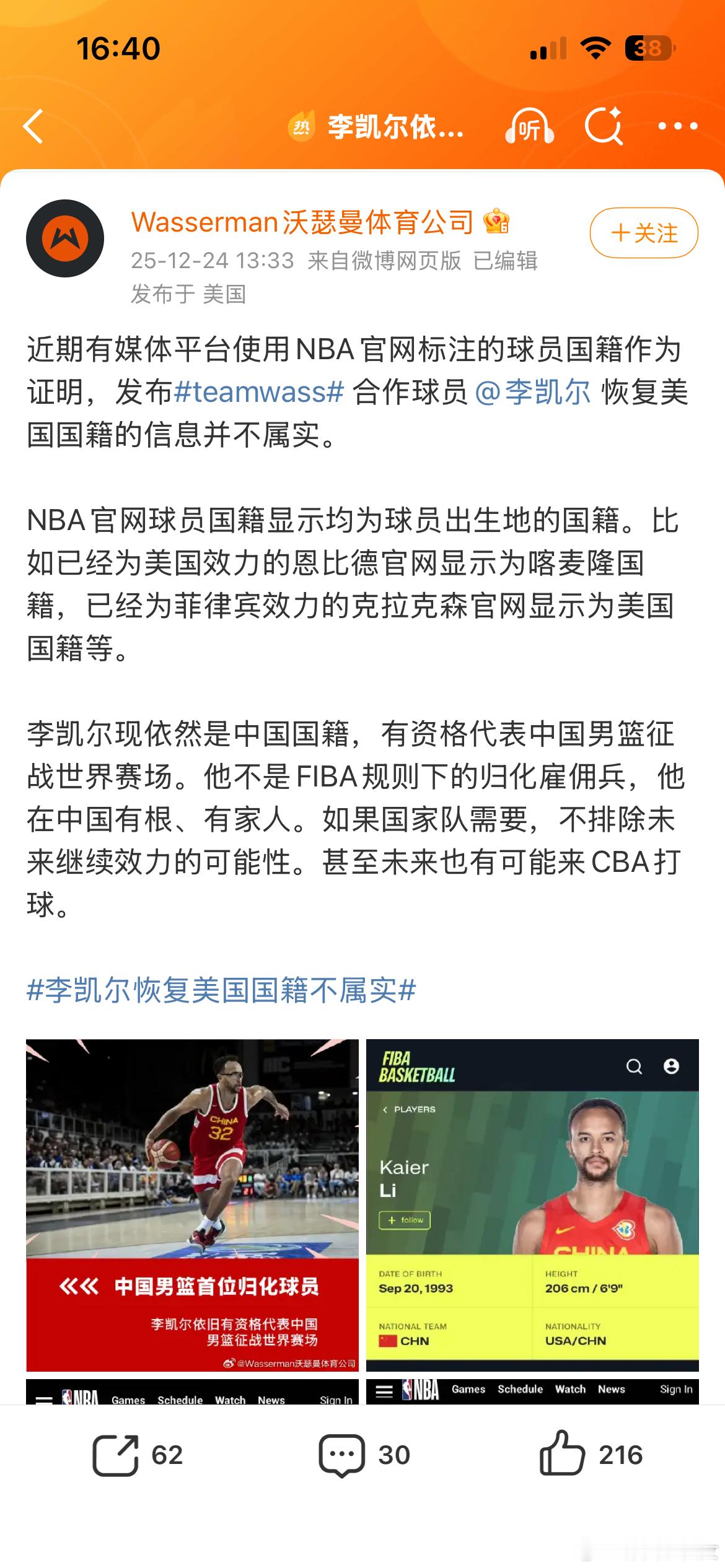 李凯尔否认国籍变更李凯尔恢复美国国籍不属实!网传消息系误解!NBA官网国籍标注以出生地为准,恩比德、克拉克森案例可证。李凯尔现仍持中国国籍,有资格代表男篮征战,非归化雇佣兵,在中国有根有家人,国家队需要时不排除续战,未来或登陆CBA!不信谣不传谣,以官方信息为准!李凯尔说什么都没改变