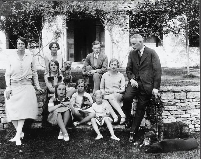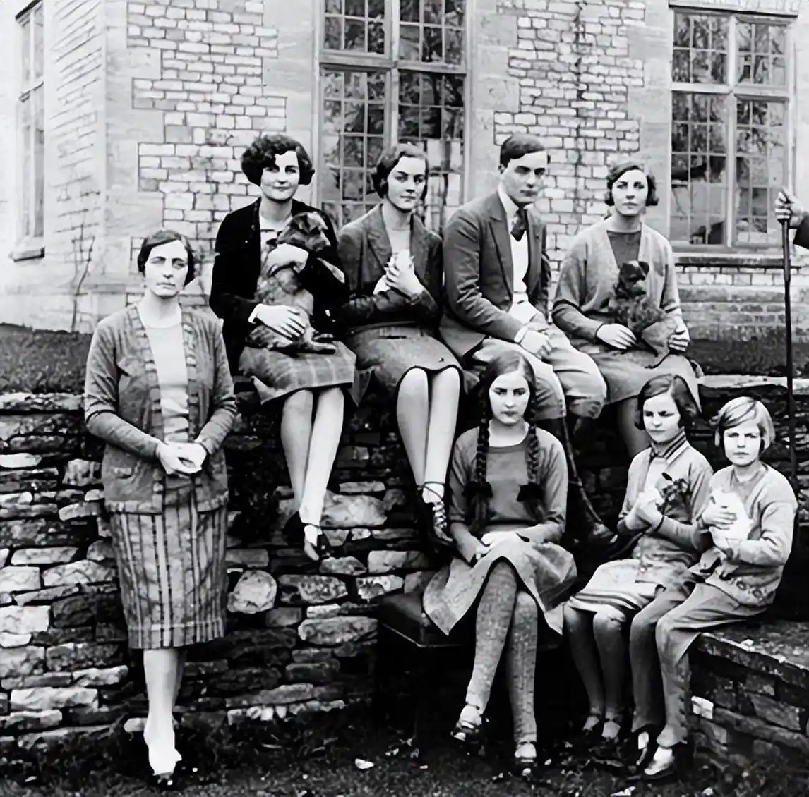 【来自投稿】英国雷斯戴尔男爵大卫·弗里曼·米特福德一家的家族合照。大卫和妻子西德妮育有六女一子,六个女儿即英国现代史上赫赫有名的“米特福六姐妹”,人们将她们概括为“一个公爵夫人,一个法西斯分子,一个共产主义者,一个纳粹分子,一个小说家,一个无名氏”。他们的长女南茜是一位作家,次女帕梅拉喜欢田园生活,三女戴安娜是一位法西斯分子,四女尤妮蒂是纳粹分子,五女杰西卡是共产主义者,幺女狄波拉是第十一代德文郡公爵夫人。大卫和西德妮倾向于法西斯主义,他们的独子汤姆也倾向法西斯主义,二战期间因为不想对德作战去了缅甸,最终于1945年战死,是七姐弟中第一个去世的。大卫从此变成反战分子,并痛恨德国。西德妮自始至终和戴安娜、尤妮蒂站在一起。南茜厌恶法西斯主义,因此和戴安娜、尤妮蒂交恶,三姐妹中断联系数年。帕梅拉私下是反犹分子,但并未公开表态。杰西卡和表弟埃斯蒙德·罗姆利·丘吉尔都是共产主义者,二人私奔到美国,一度和全家断联。狄波拉是米特福德家族唯一一个终身都不曾表明过政治立场的成员,也是唯一一个在阶级内婚嫁的女儿,是七姐弟中最后一个离世的。