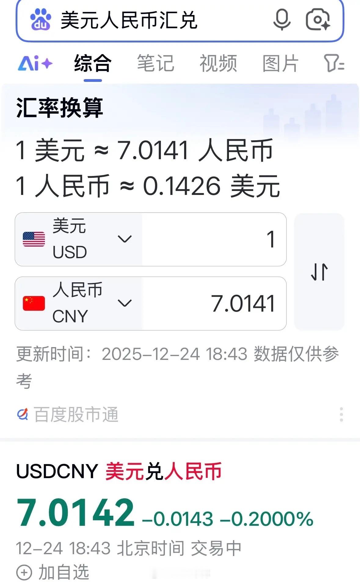 7.014,又大涨千分之二,人民币兑美元,破7.0也就只差这些了!看来在年底(2026来临之前),有望见到6.0时代。也许这就是许多机构敢公开宣称2026年A股将比2025年走得更稳更好的主要原因,人民币升值,作为核心资产的A股,也同样得将会估值重构。有人说是年底外贸公司结汇的原因,这也是主要原因之一,但这也是看到人民币持续走高而不得不为之吧!个人判断主要应该是避险资金在尝试流入。毕竟A股多年以来,才从3000点升至4000不到,如此明显的价值洼地,不相信例如主权资金的这些大资金会置之不顾。逐利本就是它们的本性。