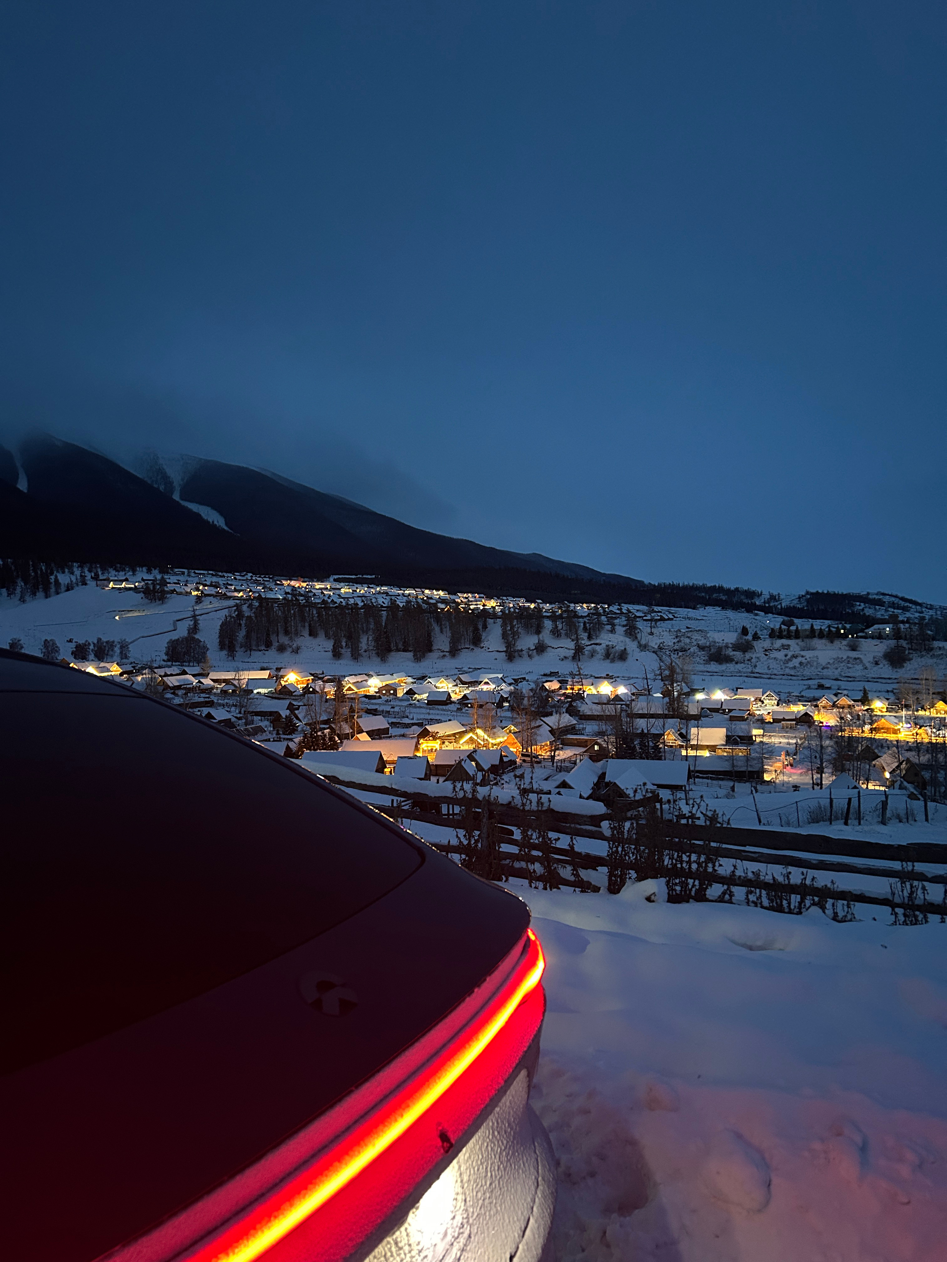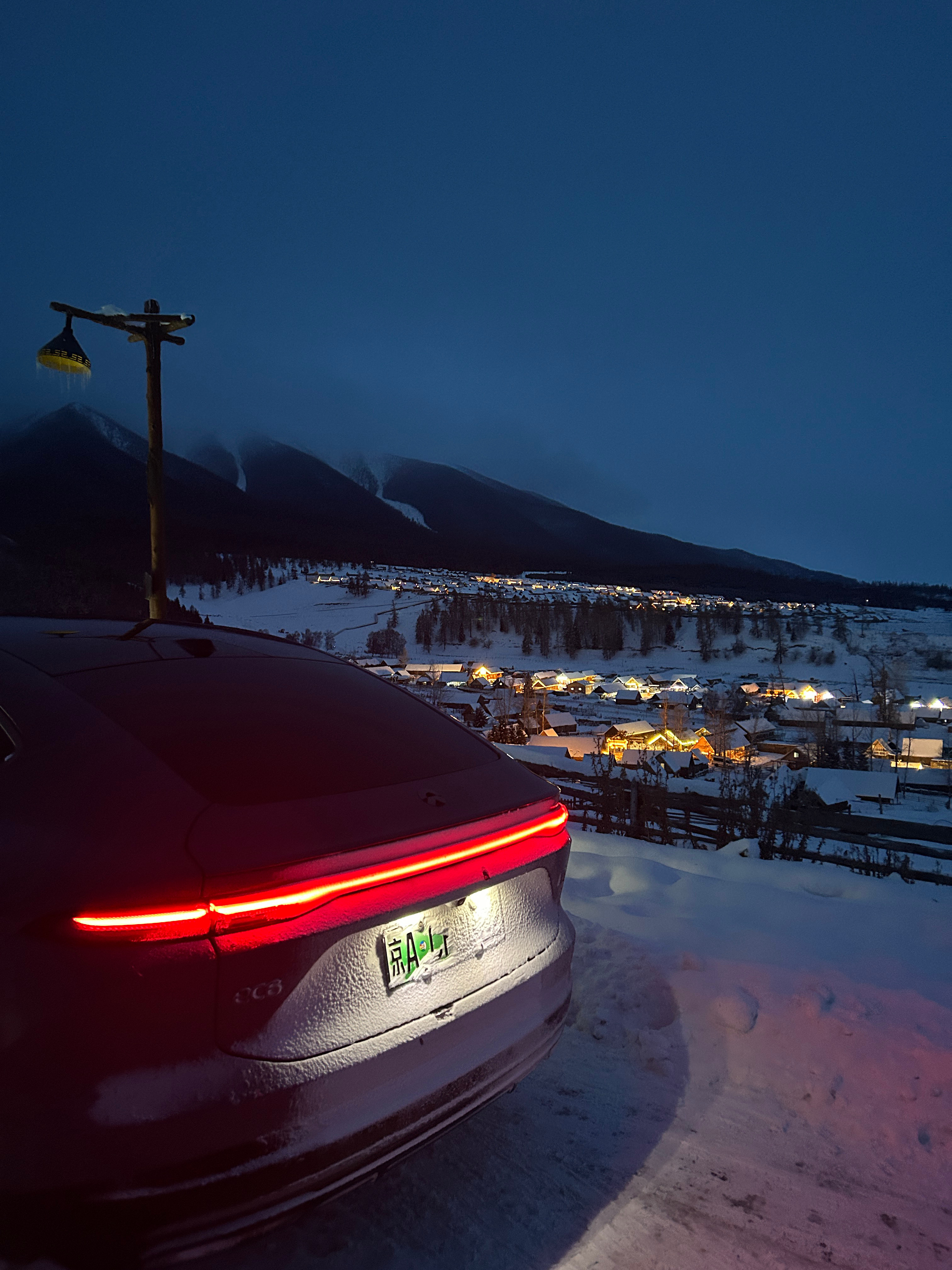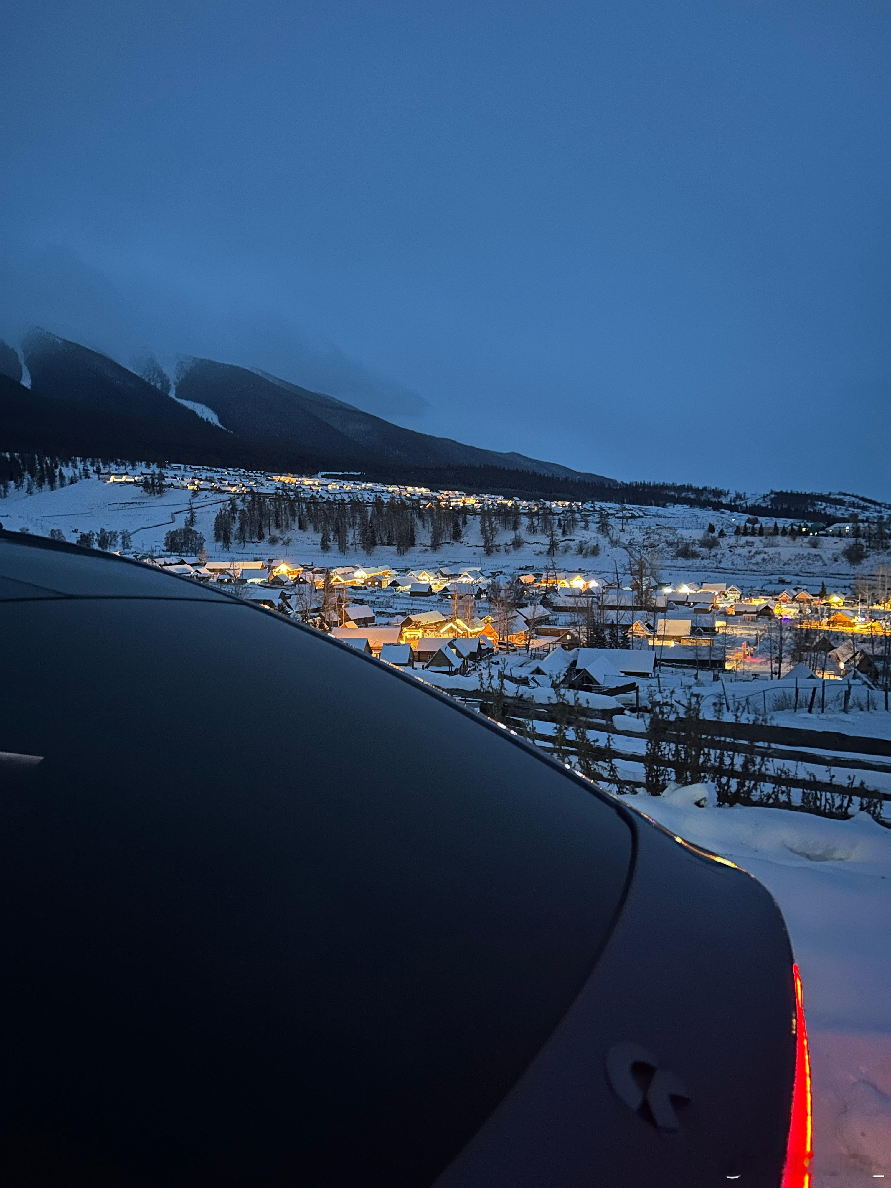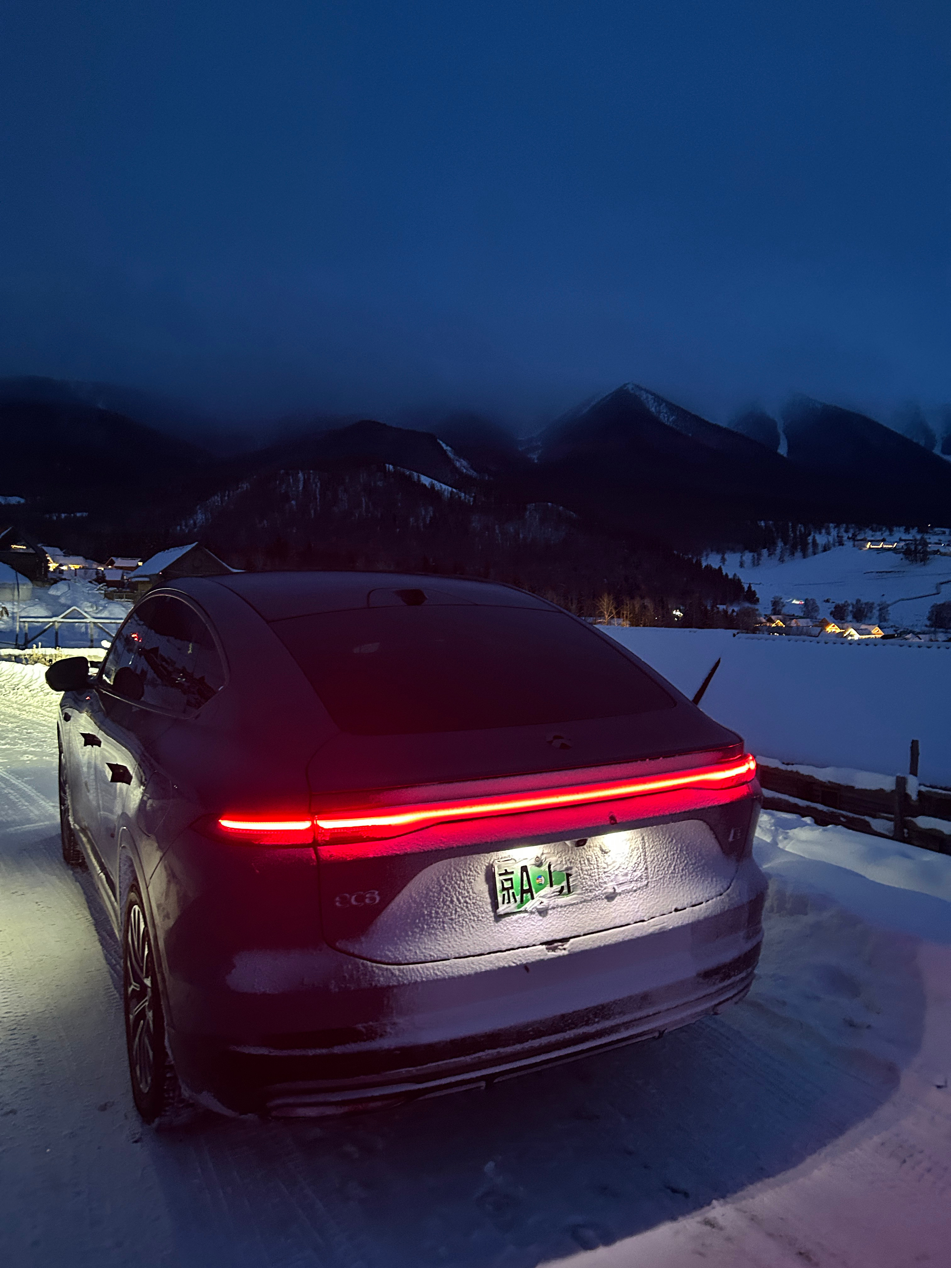 这是一个很普通的夜晚,在白哈巴,我把车开上了老村的平台上,因为老村在山上,所以站在这里可以看到整个新村,新村确实商业化要重一些,都是饭店和民宿,但这一点都不影响它漂亮,刚刚日落完全消失的这段时间特别的有沉浸感~开进西北第一村白哈巴的纯电车在这个时间段好像只有我一辆,所以我能听到来来往往的人说:蔚来!!!京A!!!纯电!!!有地方充电吗???能跑多远???四驱???emmmm,我想说:1.我都已经开到这里了,所以充电一定是方便的。2.我能开到这里,续航里程一定少不了。3.来这里必须得是四驱。我现在真的希望阿勒泰地区能建设几个换电站,这样就更爽了!