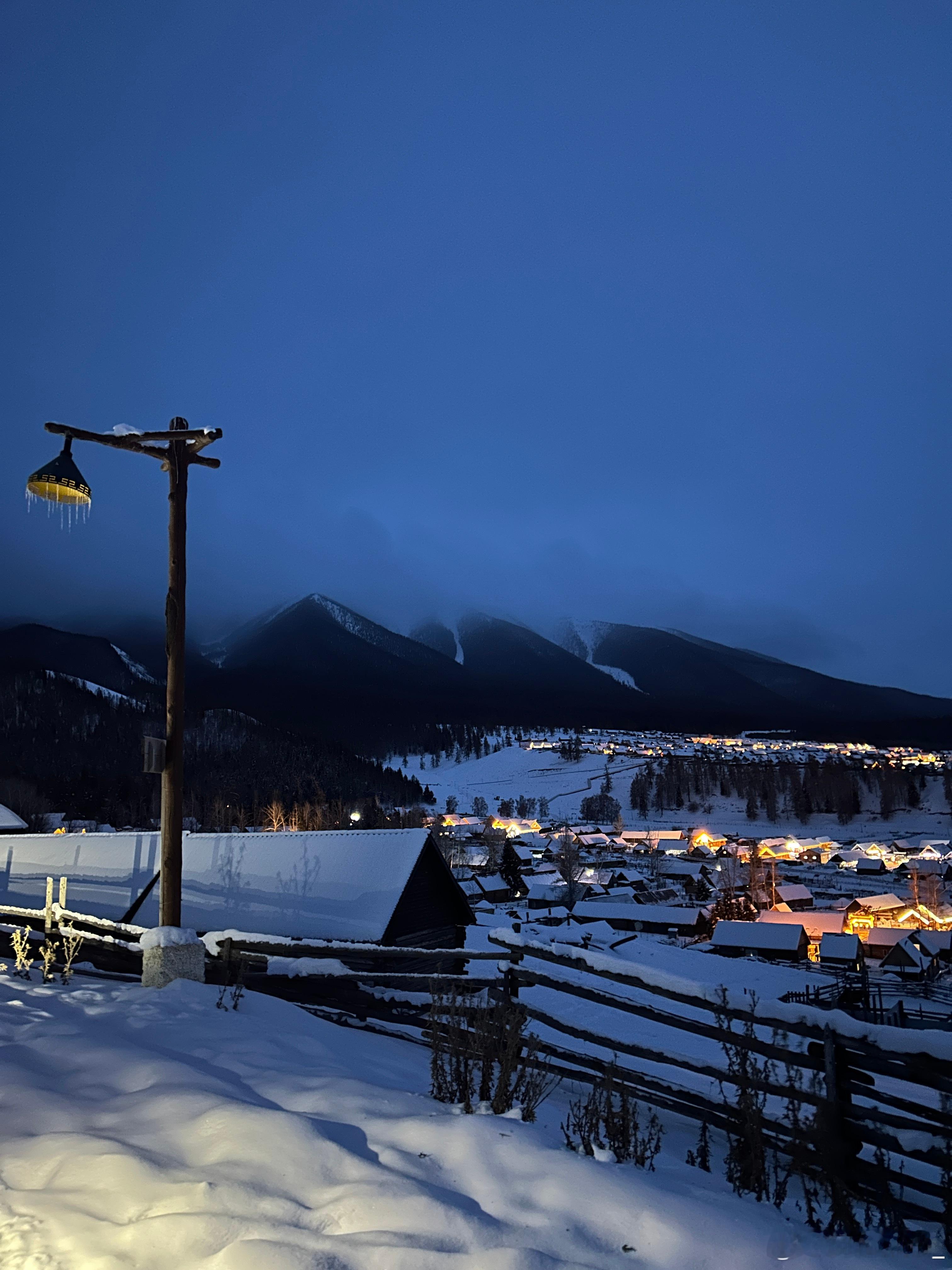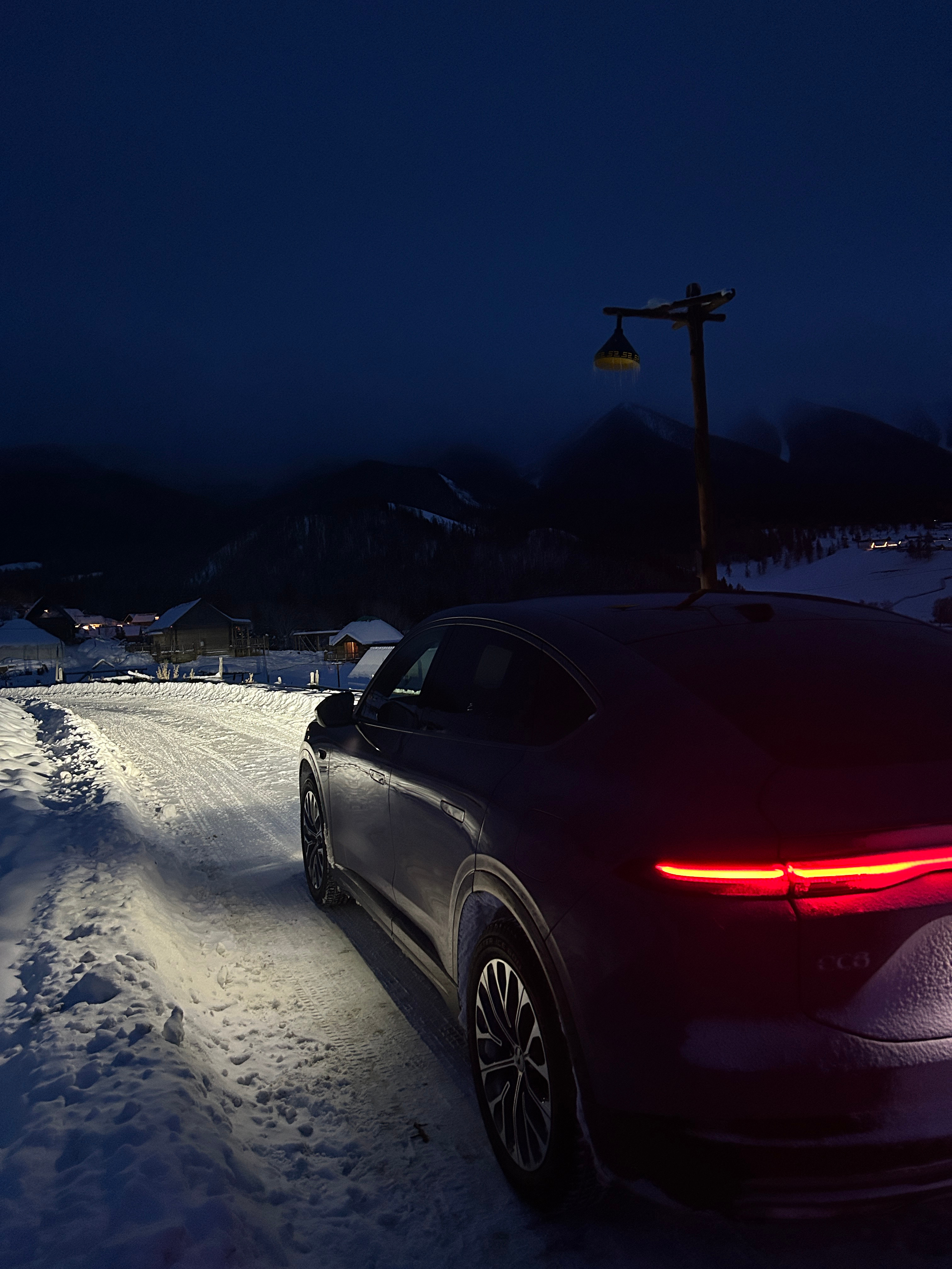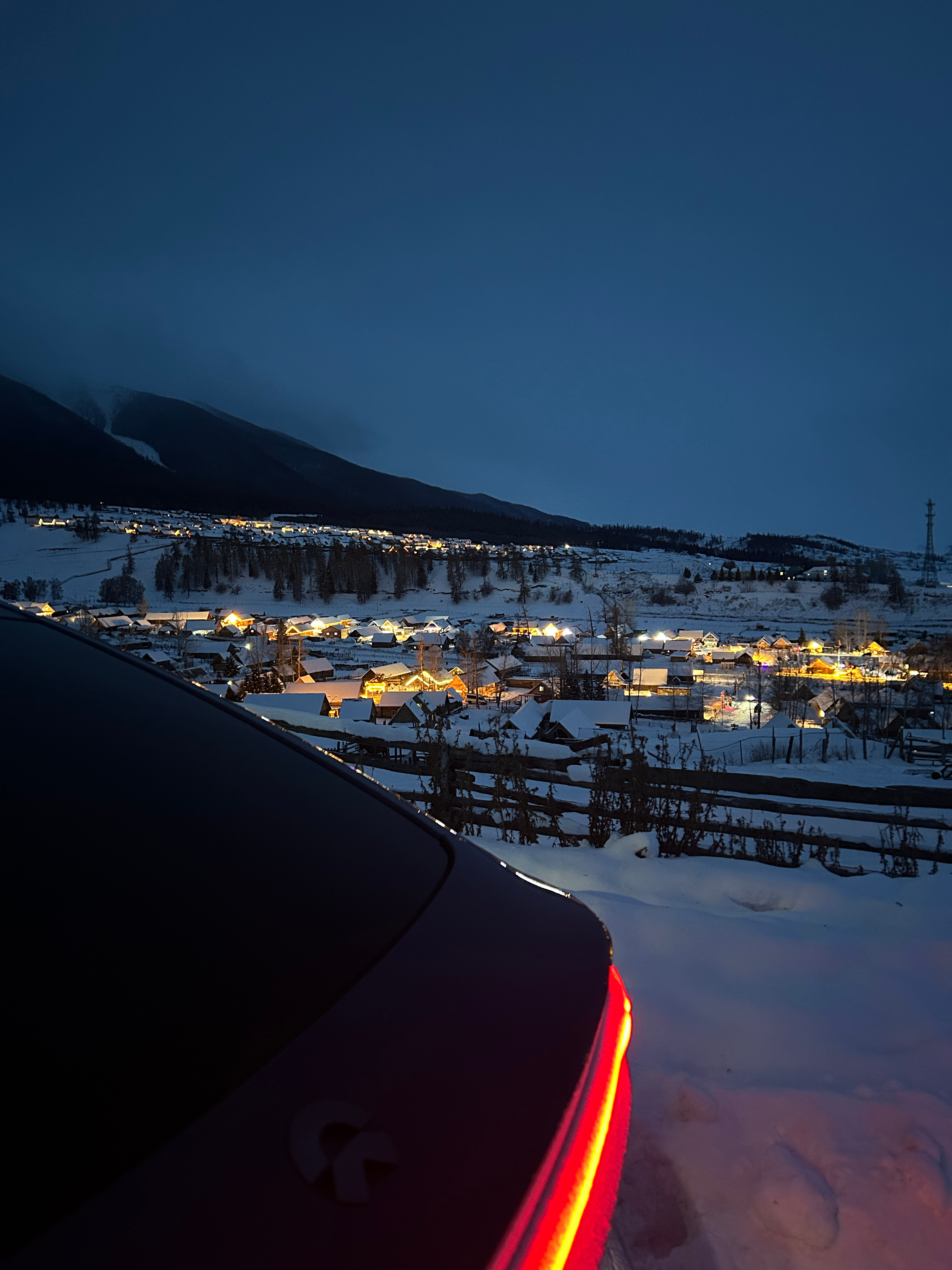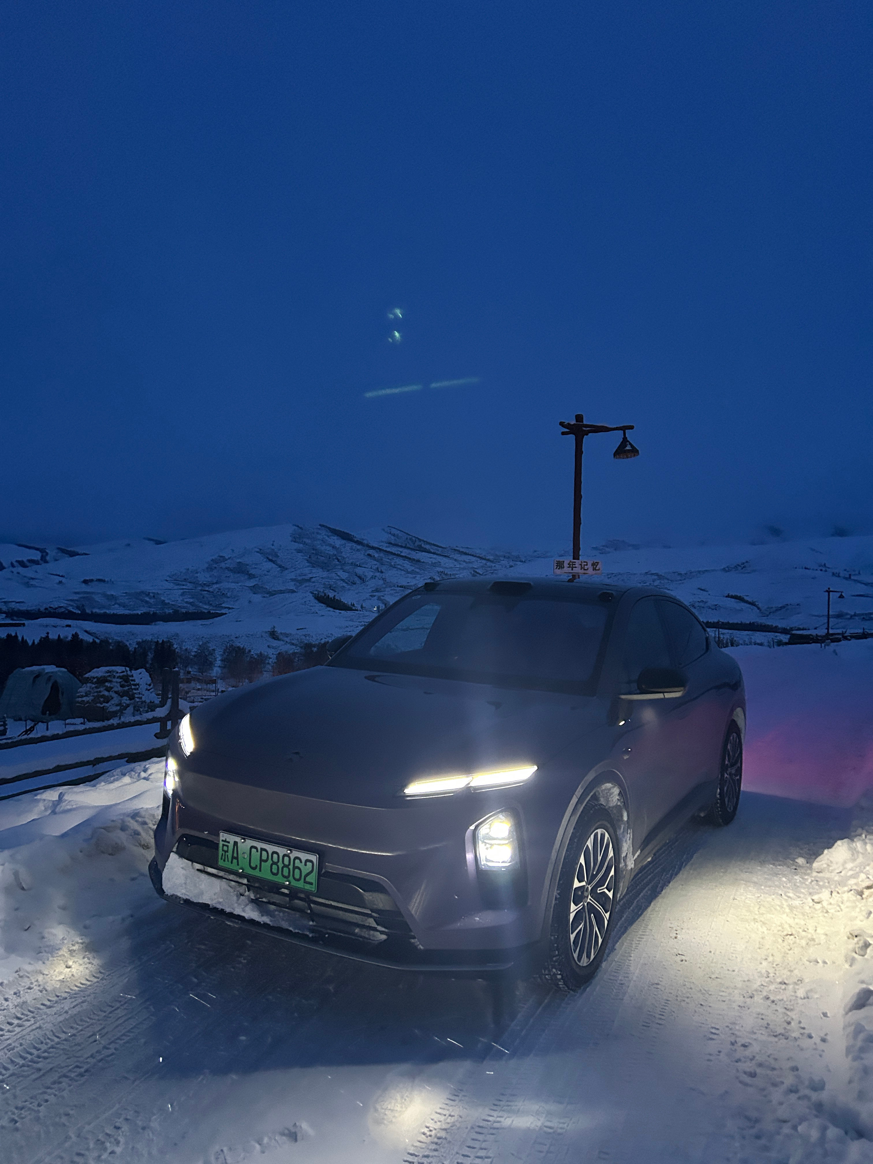 这是一个很普通的夜晚,在白哈巴,我把车开上了老村的平台上,因为老村在山上,所以站在这里可以看到整个新村,新村确实商业化要重一些,都是饭店和民宿,但这一点都不影响它漂亮,刚刚日落完全消失的这段时间特别的有沉浸感~开进西北第一村白哈巴的纯电车在这个时间段好像只有我一辆,所以我能听到来来往往的人说:蔚来!!!京A!!!纯电!!!有地方充电吗???能跑多远???四驱???emmmm,我想说:1.我都已经开到这里了,所以充电一定是方便的。2.我能开到这里,续航里程一定少不了。3.来这里必须得是四驱。我现在真的希望阿勒泰地区能建设几个换电站,这样就更爽了!