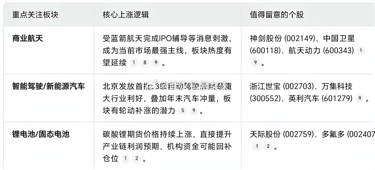 明日有望涨停的板块及个股根据今天的市场表现和机构分析,明天(12月25日)有几个板块和个股值得重点关注。下面汇总了核心信息,方便老板们快速把握要点。重点关注板块 核心上涨逻辑 值得留意的个股商业航天 受蓝箭航天完成IPO辅导等消息刺激,成为当前市场最强主线,板块热度有望延续。 神剑股份 (002149)、中国卫星 (600118)、航天动力 (600343)。智能驾驶/新能源汽车 北京发放首批L3级自动驾驶牌照是重大行业利好,叠加年末汽车冲量,板块有轮动补涨的潜力。 浙江世宝 (002703)、万集科技 (300552)、英利汽车 (601279)。锂电池/固态电池 碳酸锂期货价格持续上涨,直接提升产业链利润预期,机构资金可能回补仓位。 天际股份 (002759)、多氟多 (002407)。AI算力/液冷服务器 受英伟达GB300服务器出货量高增预期刺激,算力硬件需求旺盛,液冷技术渗透率有望提升。 英维克 (002837)、生益科技 (600183)。💡 板块深度解析与策略1. 商业航天:聚焦龙头今天是市场的绝对主线,板块内出现涨停潮。明日板块可能会经历分化,资金将从普涨转向聚焦真正的核心龙头。操作上,应重点关注那些换手充分、承接力强的个股,避免追高跟风的后排股票。2. 智能驾驶与新能源:关注轮动机会L3级自动驾驶牌照的发放是里程碑事件。这个方向与锂电池同属大科技和高端制造范畴,可能形成轮动效应。关注点可以放在直接受益于智能驾驶硬件的个股上。3. 锂电池与AI算力:趋势延续这两个板块都有强大的产业逻辑支撑。锂电池方面,关注碳酸锂涨价最受益的锂矿和电池厂标的。AI算力方面,核心是服务器产业链和光模块等硬件,这是一个中长期趋势。⚠️ 明日操作建议- 注意板块分化:像商业航天这样今日全面爆发的板块,明天大概率会分化。资金会“去弱留强”,重点观察核心龙头股的表现和承接力,对于非主线的跟风股需谨慎。- 警惕高位风险:对于已经连续缩量涨停的个股,如果明天早盘直接大幅高开甚至涨停开盘,不要盲目追入,防止主力资金借机派发筹码。- 把握整体节奏:明天是圣诞节,虽然北向资金缺席,但内资主导的市场情绪可能依然较高。建议采取“轻指数、重个股”的策略,主要关注科技主线的轮动机会,同时留意大盘在3950点压力位附近可能产生的震荡。💎 总结简单来说,明天的机会依然集中在政策驱动和产业趋势明确的科技成长板块。操作上,建议优先在主流板块中寻找有换手、有承接的强势股,并注意控制仓位,避免在情绪高点过度追涨。希望这些分析能为你提供参考。