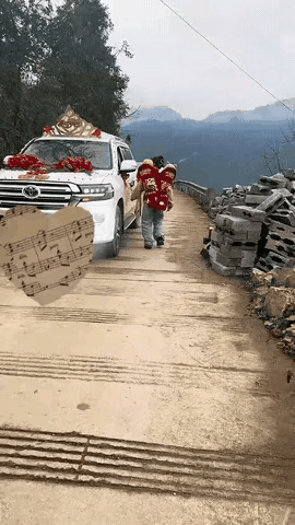 云南一宝妈,背着龙凤胎回家的路上,恰巧遇到一结婚车队,宝妈为了给两个宝宝讨个喜头