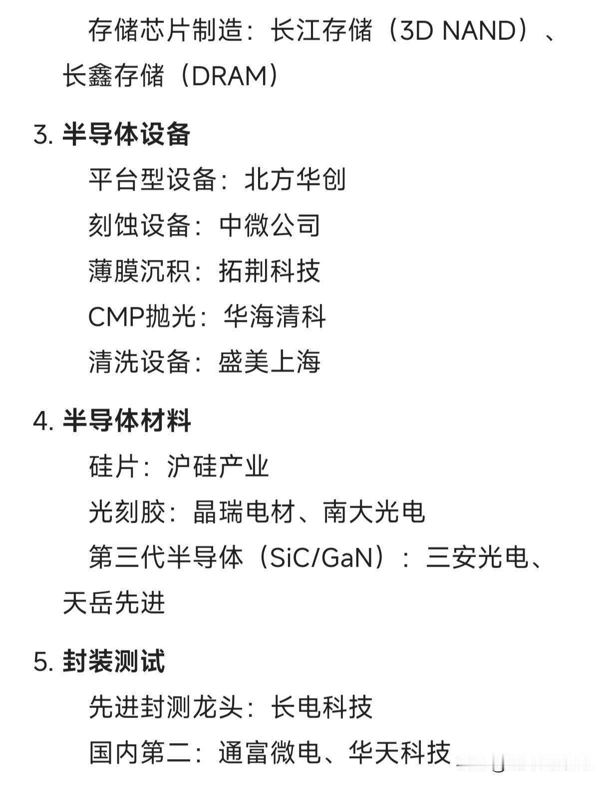 国产芯片产业链核心环节及各领域龙头公司 芯片设计  综合龙头:华为海思  手机/物联网:紫光展锐  CIS图像传感器:韦尔股份  存储/MCU:兆易创新  AI芯片:寒武纪、地平线  RISC-V生态:平头哥半导体 芯片制造(晶圆代工)  先进制程:中芯国际  特色工艺:华虹半导体  存储芯片制造:长江存储(3D NAND)、长鑫存储(DRAM) 半导体设备  平台型设备:北方华创  刻蚀设备:中微公司  薄膜沉积:拓荆科技  CMP抛光:华海清科  清洗设备:盛美上海 半导体材料  硅片:沪硅产业  光刻胶:晶瑞电材、南大光电  第三代半导体(SiC/GaN):三安光电、天岳先进 封装测试  先进封测龙头:长电科技  国内第二:通富微电、华天科技 EDA/IP/工具链  EDA软件:华大九天  FPGA:紫光国微、复旦微电 关键芯片细分  射频前端:卓胜微  电源管理:圣邦股份  内存接口:澜起科技  安全芯片:国民技术、飞天诚信