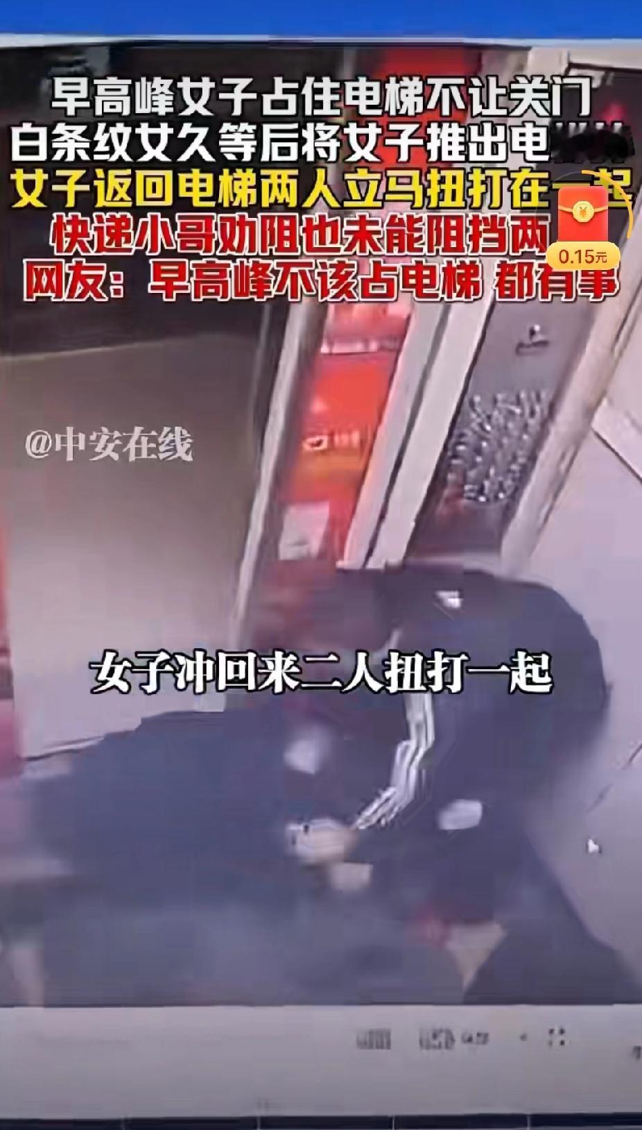 快发业主群[笑哭]让早高峰爱占电梯的人掂量掂量,总有人不惯着他们。即使挨打了,舆论也一边倒的谴责他们! 12月24日早高峰时段,黑衣女子为等待同伴,用身体阻挡电梯门关闭长达3分钟以上,导致电梯滞留,同乘电梯的条纹衫女子多次催促无效后,一掌将黑衣女子推出电梯;黑衣女子立即返回轿厢,双方爆发激烈扭打,条纹女子貌美,身高腿长,一直压制黑衣女子,现场快递员劝阻失败。 这一冲突场景被电梯内监控完整记录下来,视频流出后瞬间在网络上引发轩然大波。网友们大多站在了条纹衫女子这边,纷纷指责黑衣女子的自私行为。毕竟早高峰时间大家都赶着上班,每一秒都很宝贵,黑衣女子为等同伴,不顾他人时间,用身体挡门的做法实在让人难以接受。 在业主群里,这事儿也炸开了锅。大家你一言我一语,声讨黑衣女子的声音此起彼伏。有人说早就看不惯那些在早高峰占着电梯不走的人了,这回条纹衫女子算是狠狠出了口气;还有人感慨,要是大家都能像条纹衫女子一样勇敢站出来制止这种不良行为,或许以后类似的现象会少很多。 而对于这件事,小区物业也高度重视。他们调取了监控视频进行查看,并安排工作人员去了解双方当事人的情况。物业表示会对业主进行文明乘梯的宣传教育,同时也希望业主们遇到问题能心平气和地沟通解决,避免类似冲突再次发生。 这件事也给那些爱占电梯的人敲响了警钟,在公共场合,不能只考虑自己的利益而忽视他人的感受。要是再肆意妄为,说不定下一个被“不惯着”的就是自己。