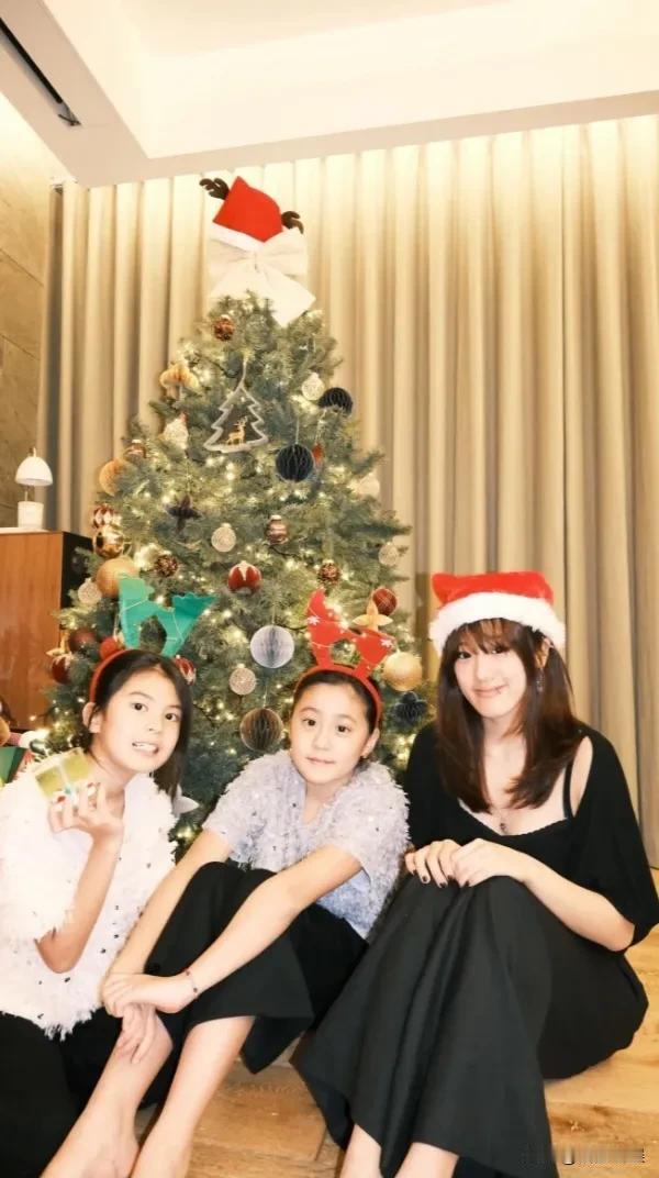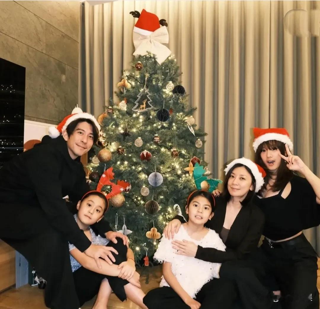 贾静雯一家子齐齐整整过圣诞,大女儿梧桐妹也在一起。 贾静雯和老公都戴着圣诞帽,穿