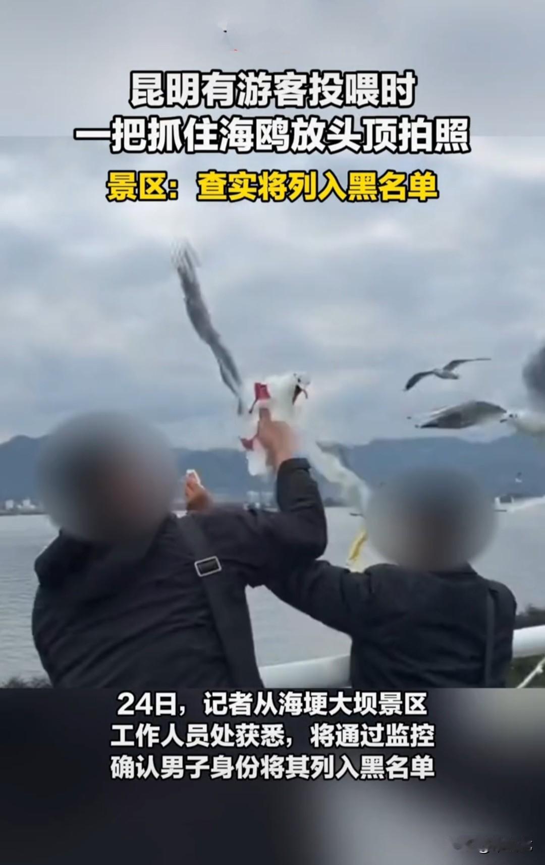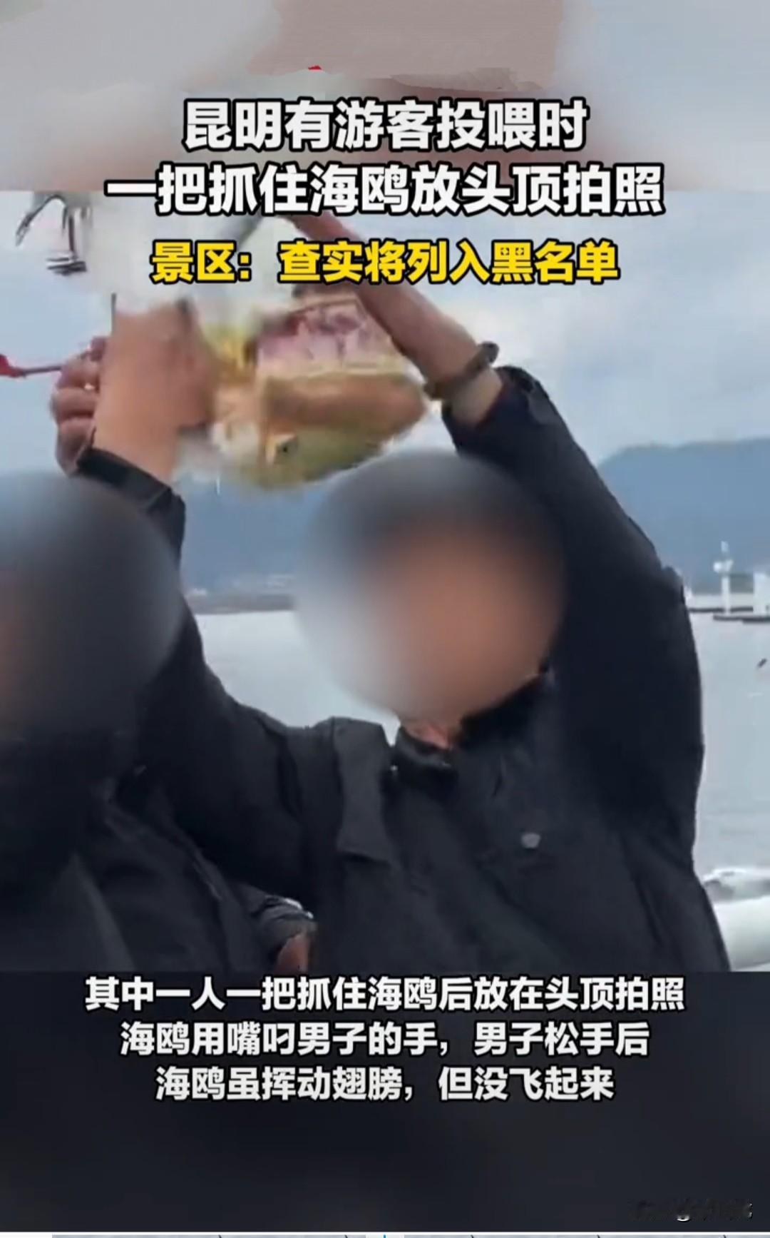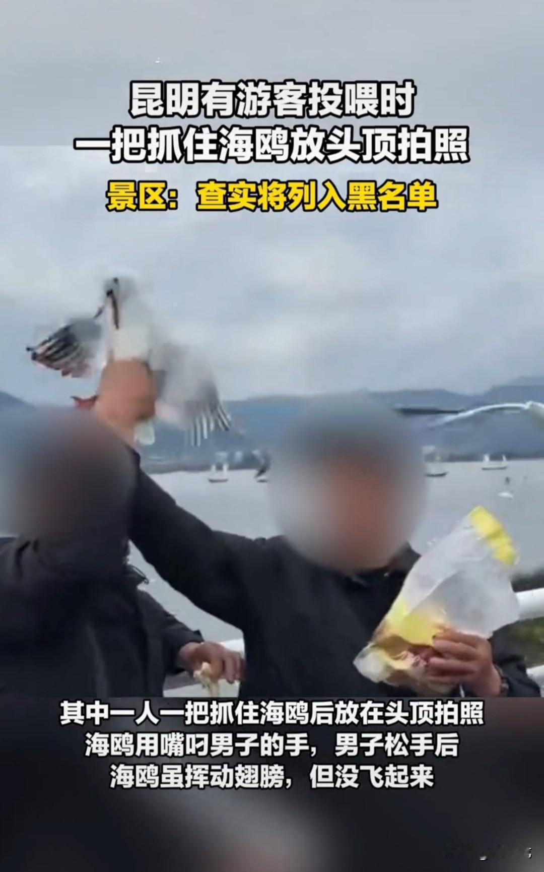 近日,网友在昆明海埂大坝景区拍到两名男子用面包投喂海鸥,趁海鸥盘旋下来啄食面包,一名男子突然伸手抓住海鸥,然后将海鸥放在头顶拍照。 海鸥受到惊吓,扑棱着翅膀拼命挣扎,男子得意地大笑着,拍完照才将海鸥松开。 松开后,海鸥径直朝水中落下去,虽然拼命扑腾翅膀,却没能再飞起来。 景区工作人员回应:将通过监控核查,确认男子身份,将其列入景区黑名单,还会安排保安加强巡查,制止这种不文明行为发生。 这种处罚对男子来说,毫无威慑力。 因为同一个景区,很少有人会去两次,尤其是外地游客。 要列就列入全国所有景区黑名单,让他到哪都寸步难行,还要追究行政责任,依法行政拘留三日并处以罚金,这样才有威慑力,其他人才不敢效仿。 为了拍照抓住海鸥,这是一种非常自私且不文明的行为,海鸥会受到惊吓,在挣扎中会受伤甚至死亡。 这种行为破坏了人与自然的和谐相处,应该受到强烈谴责。 (素材来源:新京报)