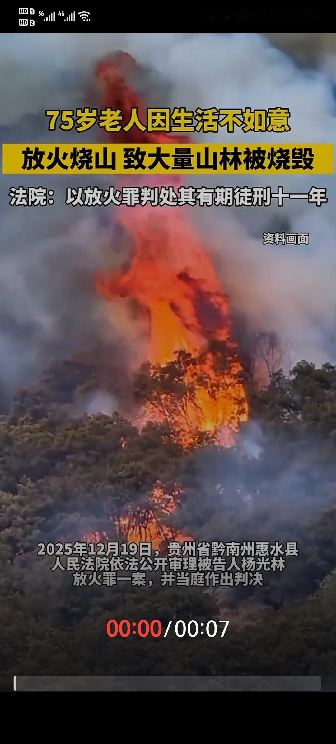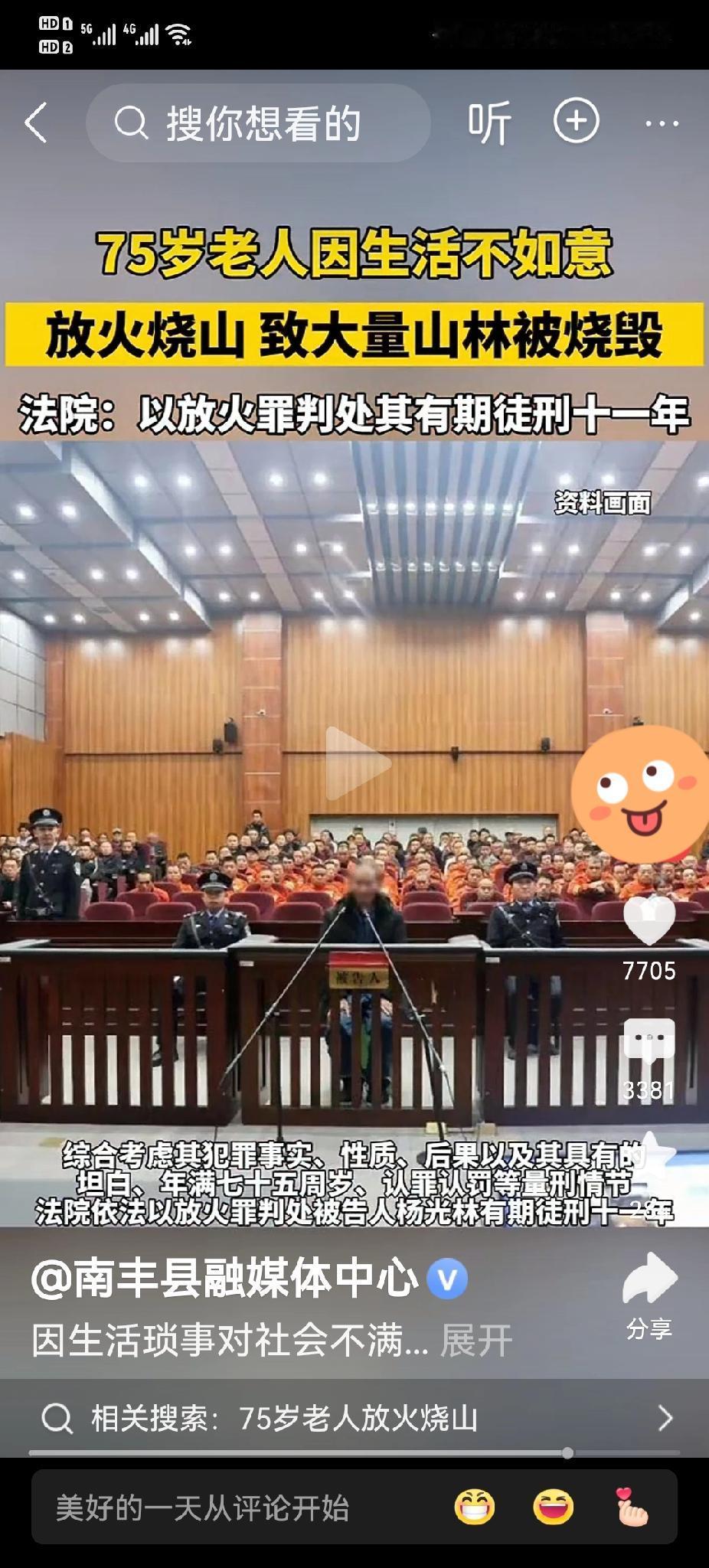 快看:75岁大爷放火烧山,判11年!一个普通老人为何走到这一步? 背后隐藏的心酸与无奈, 人生在世,有时候,真的很难去理解那些极端的行为。尤其是当一个75岁的老人,因为心中的不满,竟然放火烧山,毁掉大片森林,最后被判了11年有期徒刑。这背后,究竟藏着怎样的故事?又是什么让一个普通老人走到了这一步? 我想,很多人看到这个消息时,第一反应可能是愤怒、震惊,甚至是不解。一个年过七旬的老人,竟然会做出如此冲动的事情。可是,细细想来,也许我们更应该去理解他的心境,去体会那份压抑已久的无奈与失望。 据法院公开审理的判决书显示,杨光林老人因为生活琐事心生不满,长期对社会的某些不公感到愤懑。或许,他曾经有过梦想,有过希望,但随着岁月流逝,生活的重担逐渐压得他喘不过气来。山林曾是他心中一片净土,但在他看来,似乎已经失去了平静与安宁。 当他在那天点燃火焰,或许并非单纯的破坏冲动,而是一种极端的宣泄。有人说,他是在泄愤,是在发泄对社会的不满。也有人猜测,他的心中藏着更深的痛楚:对生活的绝望,对未来的迷茫。毕竟,75岁的老人,本应享受晚年,安享天年,可现实却让他如此绝望。 这起案件让我深思:社会的压力、家庭的琐碎、个人的无助,是否也在逐渐吞噬着我们身边的每一个人?我们是否也曾在某个瞬间,感受到那份无助与愤怒,却没有找到正确的出口?有人说,年纪大了,就应该安享晚年,但现实告诉我们,生活的压力从未放松过。 更令人心碎的是,这场火灾不仅烧毁了大片山林,也毁掉了杨光林晚年的生活。被判11年,意味着他可能要在狱中度过余生。这对他来说,是一种惩罚,更是一份无法弥补的遗憾。那些被烧毁的森林,也许永远无法恢复,那片绿意,也许永远都无法重现。 但我想说,理解和同情,不代表我们认同他的行为。我们都知道,放火是违法的,是对自然、对社会的极大伤害。法院的判决是法律的裁决,也是对社会公正的维护。我们需要的是,更多的关注那些被生活压得喘不过气的人,给予他们帮助和关怀,而不是简单的谴责。 这件事也提醒我们:每个人心中都藏着一份难以启齿的苦衷。或许,我们都应该多一点耐心,多一点理解。不要让那些心存不满的人,走到走投无路的地步。社会的温暖,或许能让他们重新找到希望。 最后,希望杨光林老人能在狱中反思,也希望他能在未来的日子里,找到内心的平静。更希望,我们每个人都能珍惜当下,关心身边的人,让这个世界多一些理解与温暖。 这个社会,不能只看到表面的风平浪静。每一个像杨光林一样的老人,都值得我们的关注和关怀。毕竟,谁都不愿意成为那个走极端的人。让我们用善意去理解,用行动去改变,让未来少一些遗憾,多一些温暖。 如果你也对这个事件有自己的看法,或者想分享你身边的类似故事,欢迎在评论区留言。让我们一起,用心去感受这个世界的每一份苦与乐。