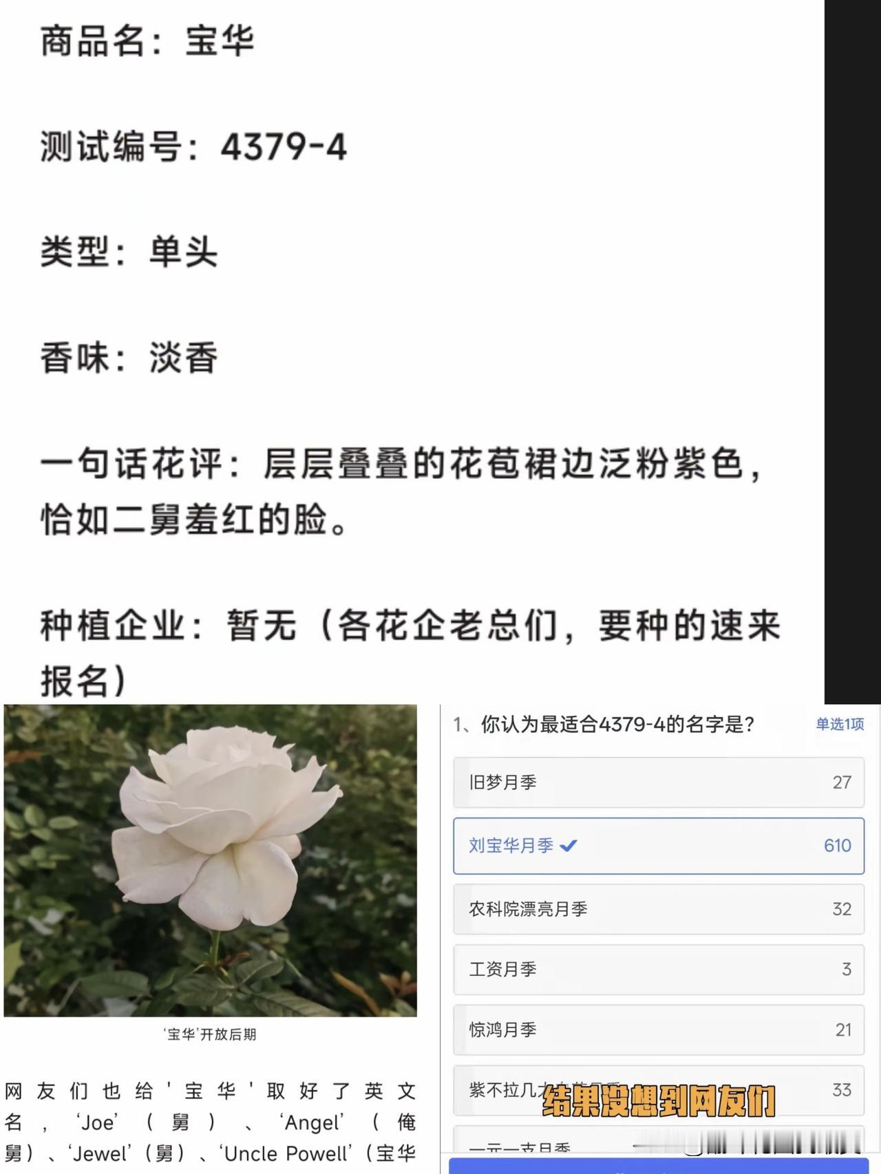 真是万万没想到, 互联网上越离谱的事越能成真。 起因是农科院为新月季品种争名,开始的时候网友的提名都还很雅致,贴合花姿的绸汕,自带浪漫感的千禧,个个都恰到好处。 谁也没料到,一条画风清奇的评论突然出圈:恳请取名“刘宝华月季”,只因自家二舅叫这个名字。本以为只是个搞笑玩梗的评论,结果全网网友集体上头,齐刷刷为这个名字投票。 更有趣的是,网友还花式脑补:宝华月季层层叠叠的花瓣泛着粉紫边,像极了二舅害羞泛红的脸颊。 让人猝不及防的是,农科院直接官宣采纳,正式定名宝华月季,还暖心感谢了这位网友的二舅。后续征集英文名时,网友又神回复:直接叫“JIU”就好! 如今农科院又出新品种征名,网友紧跟节奏喊出“男女平等”,提议定名秀芳月季,只因自家奶奶叫秀芳。 不得不说,这届网友的取名脑洞,真的太有梗了!还有一点是让我想到了当年给航母起名叫皮皮虾号航母,真的是太逗了,大家觉得呢?