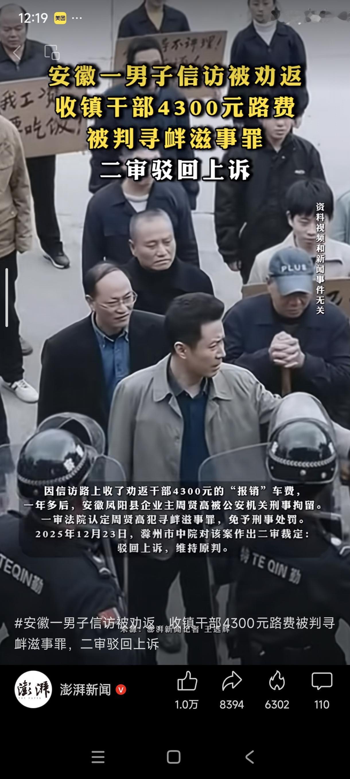 安徽凤阳县,男子的养殖场被政府拆除,因赔偿不到位想上访,在上访途中收了劝返干部报销的4300元路费,结果一年多后,被公安机关刑事拘留。一审法院认为,男子犯寻衅滋事罪,要求退还违法所得,男子不服提起上诉,结果被二审法院驳回,维持原判。对此,清华大学著名法学家周光权认为,法院的判决不合理,上访男子的行为不构成寻衅滋事。 2014年4月,安徽合肥的男子周贤高,在凤阳县成立了一家养殖场。两年半后,当地政府印发了水资源保护的相关整治方案,周贤高的养殖场位于凤阳县水库水源二级保护区,被政府关停、拆除。 周贤高委托专业的鉴定中心,对已拆除的养殖场进行了资产评估,评估价格为276万多元,当地政府认为价格太高,不同意赔偿。而政府给出的赔偿价格,差额太大,周贤高不满意。 后来,周贤高多次向相关部门反映此事,但都没有得到解决。实在没办法了,周贤高就选择了进京上访。前三次都没有成功,在第四次上访的途中,被镇干部李子文给拦截了,李子文劝他不要去上访。为了完成上访任务,李子文主动提出报销周贤高前三次的路费4300元,收到报销的路费后,周贤高也没再去上访。 可没想到,一年多后,周贤高被公安机关刑事拘留了,理由是通过“强拿硬要”手段,拿走了公职人员的4300元。 2025年6月19日,法院作出一审判决,法院认为周贤高到省里和北京上访的行为,是对当地政府进行施压。期间,通过“强拿硬要”的手段拿走他人4300元,情节严重,属于寻衅滋事罪,要求退还违法所得的4300元。 对于法院的一审判决,周贤高不服,他认为,当地政府不赔钱,当地的相关部门也不受理,上访维权是他的合法权利,于是他就提起了上诉。 12月23日,二审法院驳回上诉,维持原判。二审法院认为,周贤高不但通过上访给政府施压,还“强拿硬要”他人钱款,事实清楚,证据充分,寻衅滋事罪成立。 周贤高的律师认为,政府不进行赔偿,周贤高上方是为了维护自己的合法权益,李子文报销的4300元车票钱,有可能用的是政府的钱,而这个车票钱,本就属于后续经营支出的补偿范围,周贤高根本就不存在寻衅滋事。可法院根本不听律师的辩护。 关于“强拿硬要”,《刑法》第293条第1款第3项规定,是指行为人以非法占有为目的,违背他人意志,强行夺取或者迫使他人交付公共财物的行为。这种行为通常表现为一种“霸道”和“蛮横”的姿态,凭借自身的强势地位或者通过制造压力迫使受害者因恐惧或无奈而交出财物。 其实,关于这起案件,2025年7月份,清华大学知名法学专家朱光权就做出了评论,他认为法院以“强来硬要”给周贤高判寻衅滋事罪不成立。因为当地政府部门是国家的公权力机关,代表国家行使公权力,具有权威性和公信力,不能成为强拿硬要的行为对象。李子文给周贤高的4300元路费,是双方讨价还价后达成的真实意思,并非胁迫或者强拿硬要。 截止目前,周贤高的养殖场已经被拆八年多,赔偿款还没有到位。那么,这种不赔偿的行为,算不算违法呢? 据说,政府的赔偿金额,与周贤高评估的金额差了数百万元,如果一直没有人管,是不是就一直不会赔偿?而且,李子文劝返周贤高,也是为了自己职位。 现在对于周贤高来说,虽然二审已经驳回了上诉,但是它依然可以通过申诉等法律途径继续维权。好多人认为,把正当的维权与寻衅滋事挂钩,只会含了群众的心,违背了信访制度的初衷。