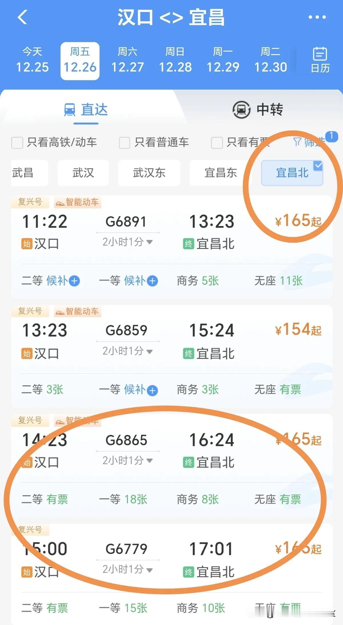 宜昌北站12月26号正式开通,今天12306平台开始放票!从APP上显示,东站到汉口基本上都是两个小时,但是票价有很大差异,到东站100元左右,到北站170元左右,你更愿意坐哪趟车?不知道接下来行程运行时间和票价有没有更多的调整,我们拭目以待!宜昌武汉高铁