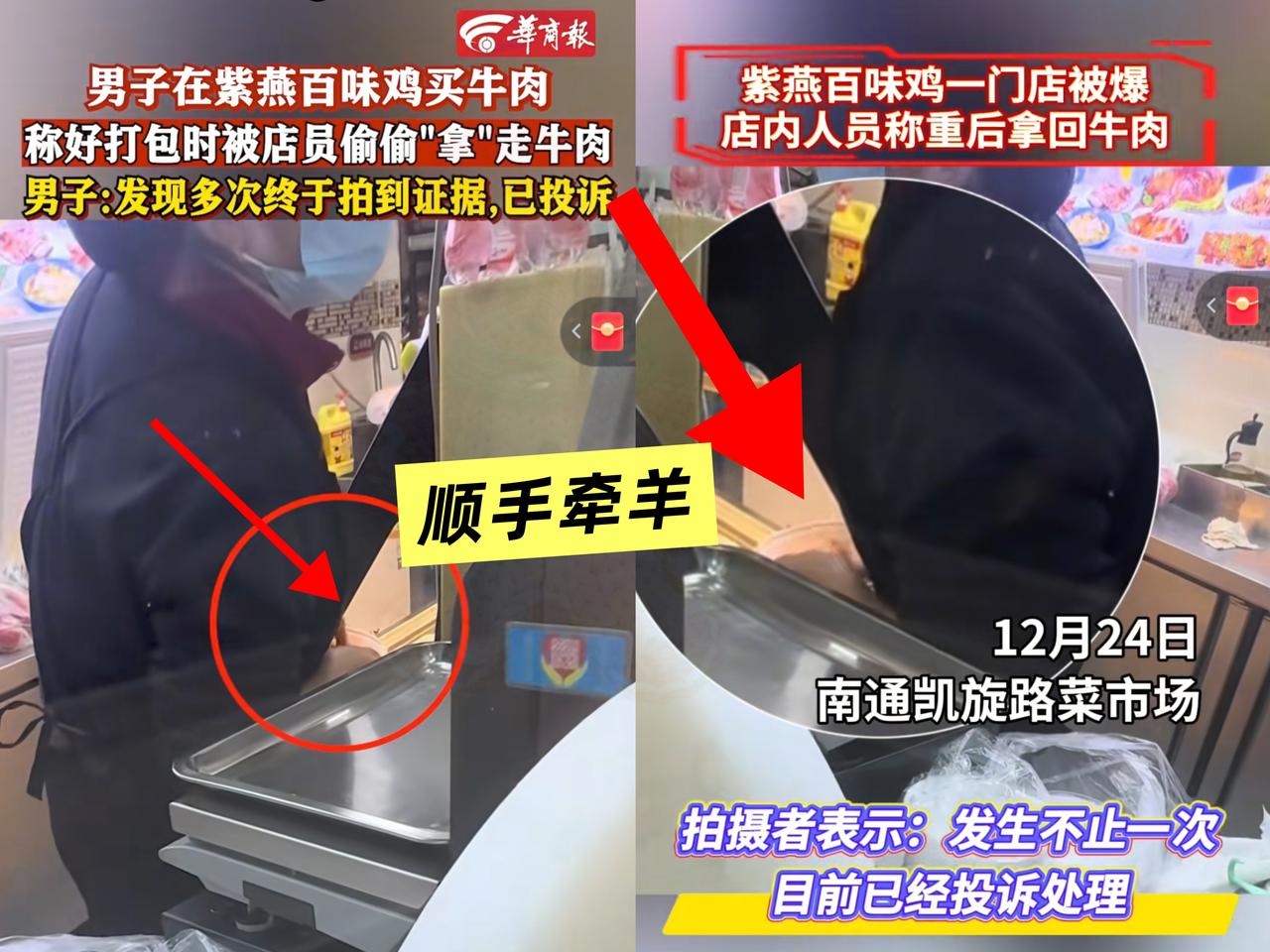 这绝对是惯犯!江苏,一男子在紫燕百味买牛肉,每次回家都觉得牛肉比称的时候少不少。琢磨半天,多次观察后,可算发现猫腻了——店员称完牛肉,总趁顾客不注意偷偷拿出几片! 男子寻思没证据说了也白搭,干脆下次直接录像。嘿,店员照旧伸手偷拿,被拍得清清楚楚。也不知道这店员是想留着下次卖,还是自己吃! 网友也纷纷吐槽,买夫妻肺片时看着满满一碗,回家全是拌料没几块肉。看来不少人都吃过亏! 大家还是得长个心眼,下次买牛肉或者其他东西,要袋子装后再称重量,别用塑料包装盒! 大家说,遇到这种情况该咋整?以后买东西还能放心不?