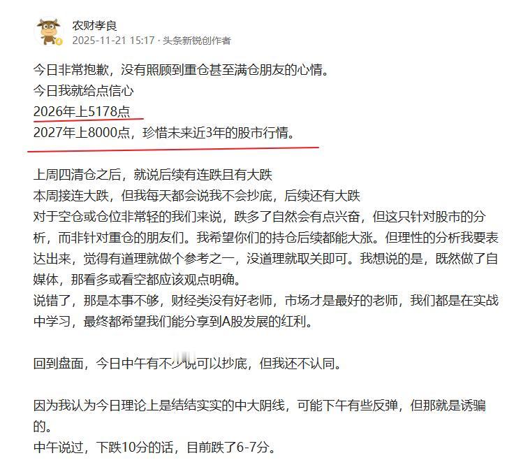 牛市第二波起点确立! 今日为啥把仓位干到三分之二? 因为第一轮调整的风险解除 平均价指数新高 那这几个月横盘就是牛市起点 所以还担心个啥 安心持股 偶尔滚动操作做T 有好方向再换方向 有些人说都4000点了,不高吗? 一点不高,3900就是第二波牛市起点中轴线 那现在就是好好选好个股,就是干! 前面大跌之后就和大家说,明年上5178 后年上8000 所以有人说我是空头 我一直解释说我不是空头 调整是为了更好的上涨 既然风险解除,后续的调整都是上涨中继 所以安心做多,偶尔换方向才会空仓。 明天有机会仓位直接打满 我是看到我想要的,我才会干,不然就是等