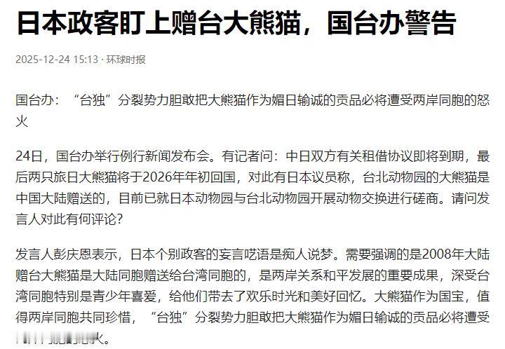 【台当局胆大包天!国台办发出罕见警告,不许“台独”送大熊猫日本】 最近这几天,日本政客窜台的闹剧还没落幕,又冒出个更离谱的幺蛾子——有日本议员居然盯上了台北动物园里的大熊猫,公然提议要搞所谓“动物交换”,而且这事还真就被他们摆上了台面正式讨论。这背后,明眼人一看就知道,根本不是什么单纯的动物交流,而是日本个别势力借大熊猫打政治算盘,再加上“台独”分子一贯媚日求和的嘴脸,才凑出的这么一出荒唐戏。 提议这事儿的是日本神户市议员上田宽弘,他上周就在社交媒体上跳出来喊,说想让日本动物园和台北动物园搞大熊猫交换。这话一出口,立马就引发了轩然大波。 要知道,日本上野动物园里最后两只旅日大熊猫“晓晓”和“蕾蕾”,2026年年初就要到期回国了,日本国内的熊猫热眼看就要降温,这时候盯上台北的大熊猫,说白了就是想找个“替代品”,顺便还能借着这事干涉两岸关系。 更让人警惕的是,这可不是日本政客第一次窜台搞小动作,之前日本国会众议员、前经济安全保障担当大臣高市早苗就曾率团窜访台湾,如今又把主意打到大熊猫身上,可见其干涉两岸事务的野心有多明显。 可他们忘了,台北动物园里的大熊猫,从来就不是台当局能随便处置的“私产”。这些大熊猫是大陆同胞送给台湾同胞的珍贵礼物,是两岸关系和平发展的见证,怎么能被“台独”分子拿来当成媚日求和的贡品? 这种打大熊猫主意的行为,本质上就是“台独”分裂势力和外部干涉势力相互勾结,企图分裂国家、破坏两岸情谊的恶劣行径,简直荒唐到了极点。 面对日本政客的妄言和“台独”分子的潜在图谋,国台办在12月24日的例行新闻发布会上,发出了前所未有的严厉警告。发言人彭庆恩直接戳穿了日本政客的图谋,称其“妄言呓语,是痴人说梦”,并明确表态:“‘台独’分裂势力胆敢把大熊猫作为媚日输诚的贡品,必将遭受两岸同胞的怒火。” “台独”分子要是真敢执迷不悟,迈出把大熊猫送给日本这一步,后果绝对是他们承担不起的。首先,从大熊猫保护和交流的角度来说,大陆是大熊猫的原产国,也是全球大熊猫保护的主导者,任何涉及大熊猫的跨地区交流,都必须基于一个中国原则,得到大陆相关部门的同意。 “台独”势力没有任何资格处置大陆赠台的大熊猫,他们要是敢私下搞所谓“交换”,就是严重破坏大熊猫保护交流的规则,未来台湾地区再想从大陆获得大熊猫,恐怕真的要打上一个巨大的问号了。 日本个别政客之所以敢这么明目张胆地觊觎赠台大熊猫,本质上也是想借这事干涉两岸事务,破坏台海和平稳定。他们心里很清楚,大熊猫在两岸关系中有着特殊意义,通过提议“交换”,既能试探大陆的底线,又能给“台独”势力撑腰打气,同时还能满足日本国内的熊猫热需求,可谓是“一箭三雕”。 但他们忘了,台湾是中国不可分割的一部分,这是国际社会公认的事实,任何企图分裂中国的行径,都注定会遭到失败;任何借两岸事务搞政治操弄的图谋,也都逃不过被戳穿的命运。 台海和平稳定是两岸同胞的共同期盼,大熊猫所承载的两岸情谊也值得我们永远珍惜。“台独”分裂势力和外部干涉势力想打大熊猫的主意,想借大熊猫搞分裂、搞破坏,简直是异想天开、痴人说梦。 我们再次正告“台独”分子:不要低估大陆捍卫国家主权和领土完整的决心和能力,也不要低估两岸同胞反对分裂、维护统一的坚定意志,胆敢把大熊猫当成媚日输诚的贡品,胆敢挑战一个中国原则的底线,必将遭到历史的审判和两岸同胞的共同怒火,最终只会落得个身败名裂、遗臭万年的下场!
