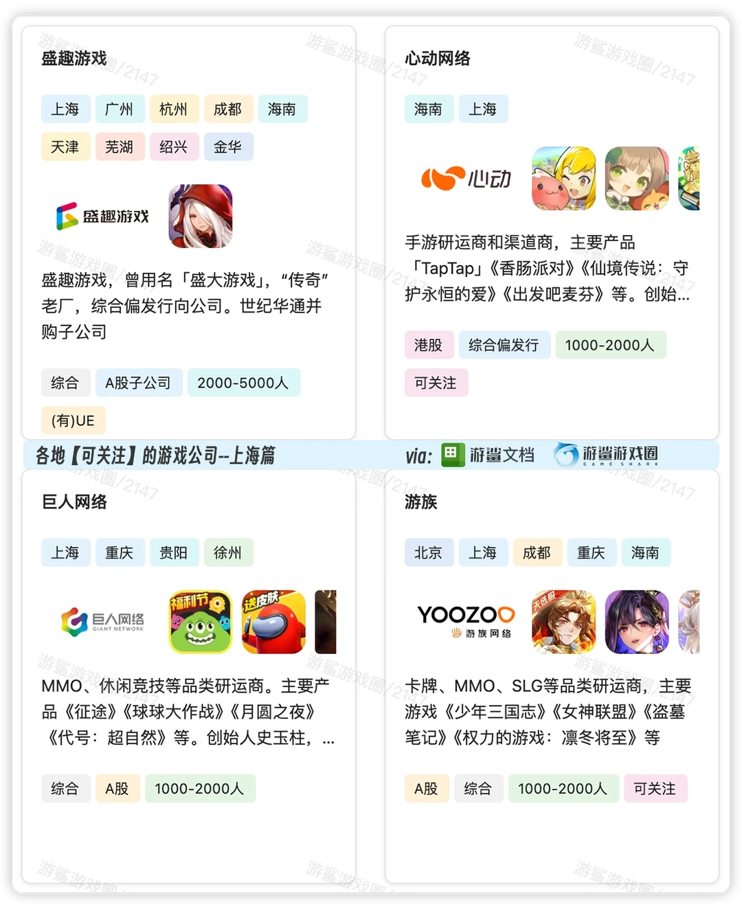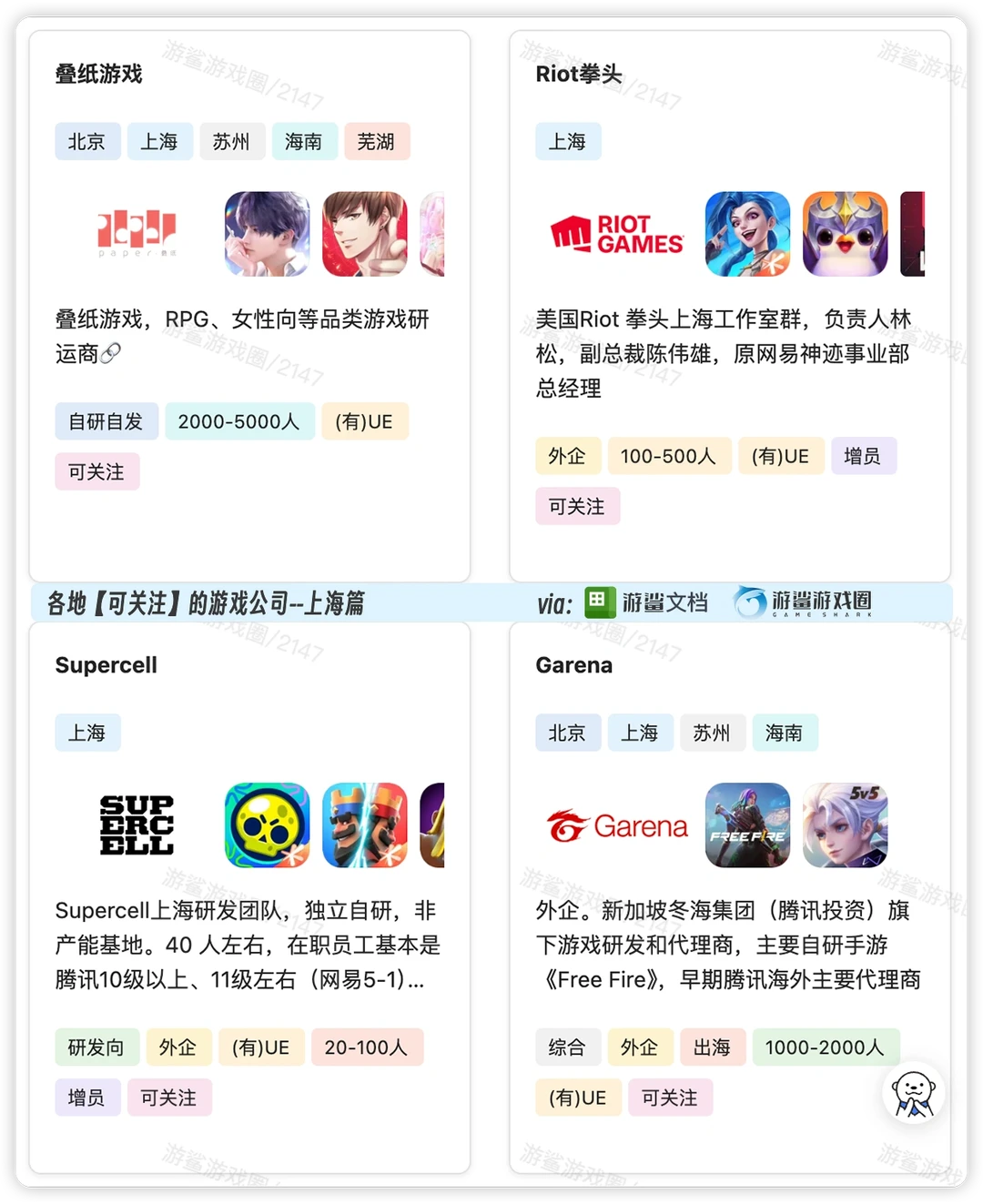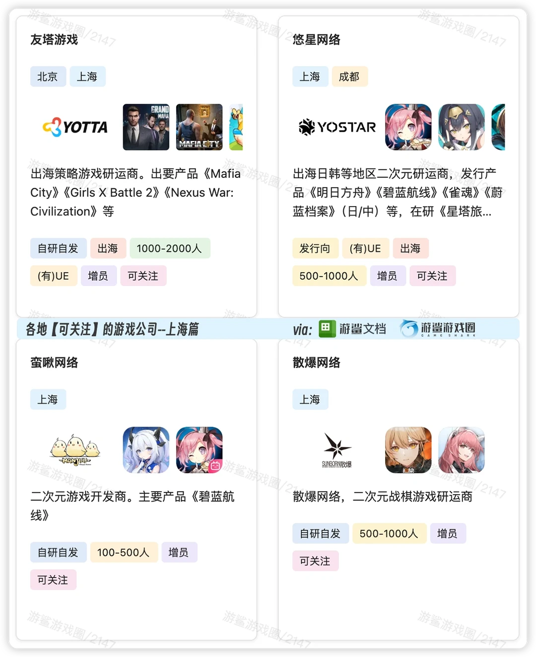 米哈游、莉莉丝、叠纸、鹰角、拳头、Garena、沐瞳、EA、动视、悠星、Supercell、Wargaming、CCP、紫龙上海、椰岛、蛮啾、友塔、波克、游族、盛趣、巨人、心动、胖布丁、镜心智能、游之趣、所思科技、上海隆匠、身梦、鸟鸣啾唧、泰乐坊、趣糖、奥萌尼、乘风云起、左目互娱、腾讯上海、网易上海、灵犀互娱上海、育碧上海、乐元素上海…