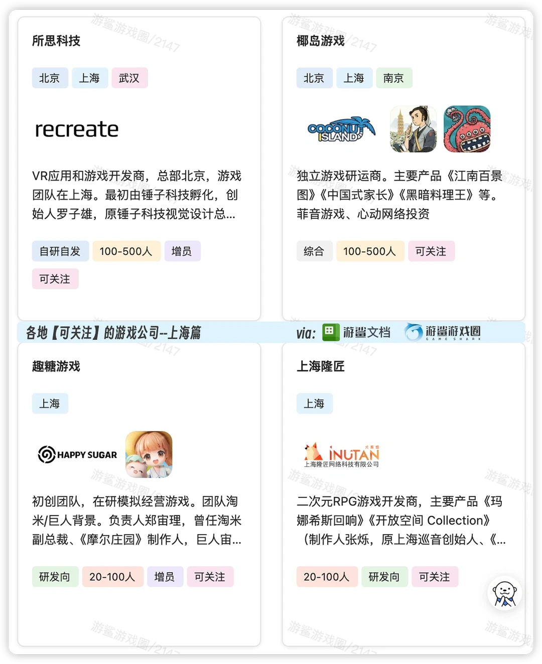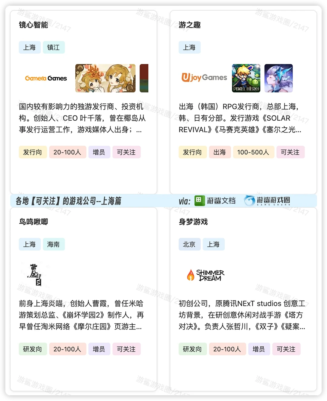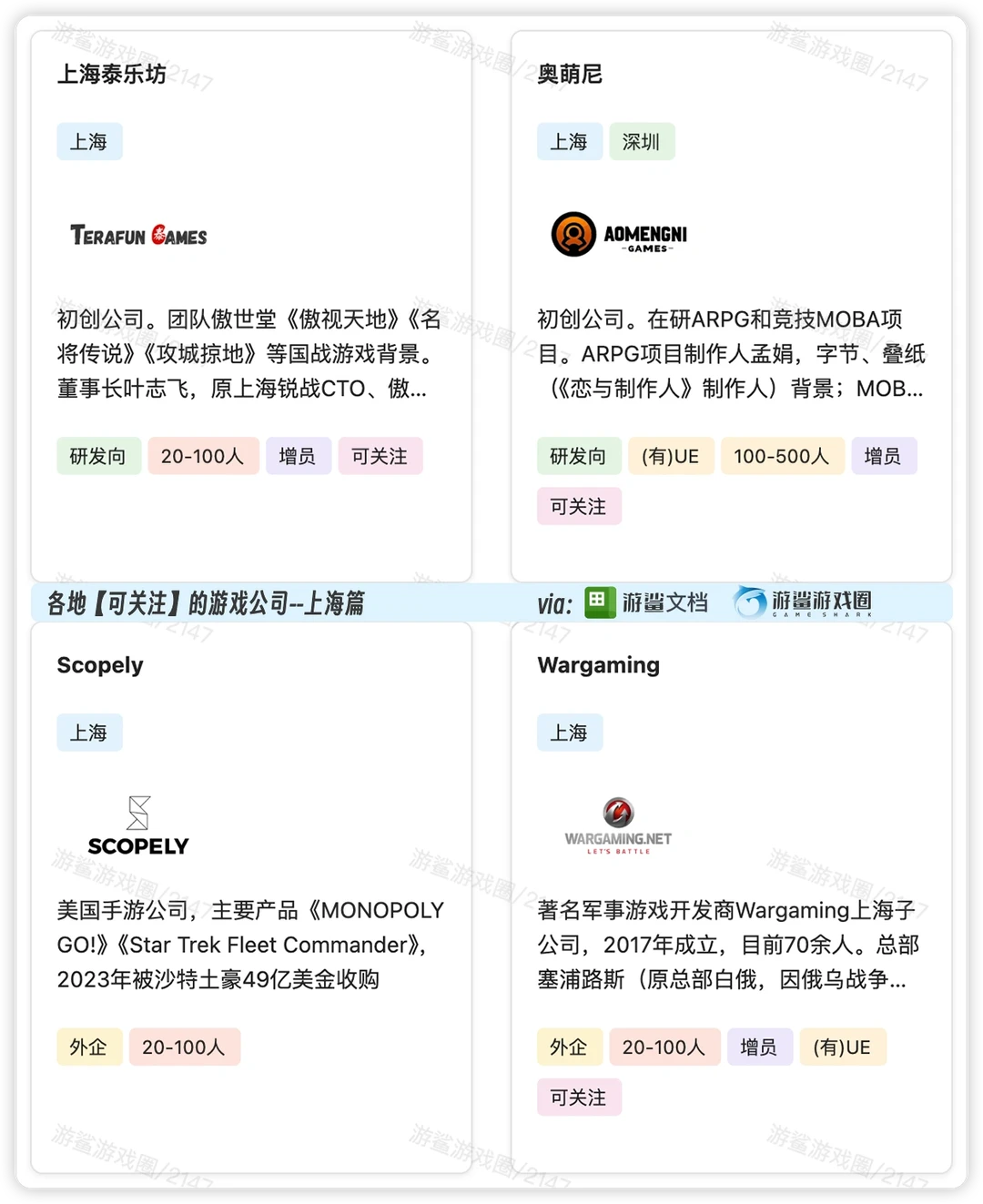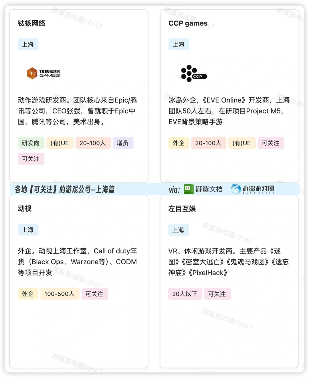米哈游、莉莉丝、叠纸、鹰角、拳头、Garena、沐瞳、EA、动视、悠星、Supercell、Wargaming、CCP、紫龙上海、椰岛、蛮啾、友塔、波克、游族、盛趣、巨人、心动、胖布丁、镜心智能、游之趣、所思科技、上海隆匠、身梦、鸟鸣啾唧、泰乐坊、趣糖、奥萌尼、乘风云起、左目互娱、腾讯上海、网易上海、灵犀互娱上海、育碧上海、乐元素上海…