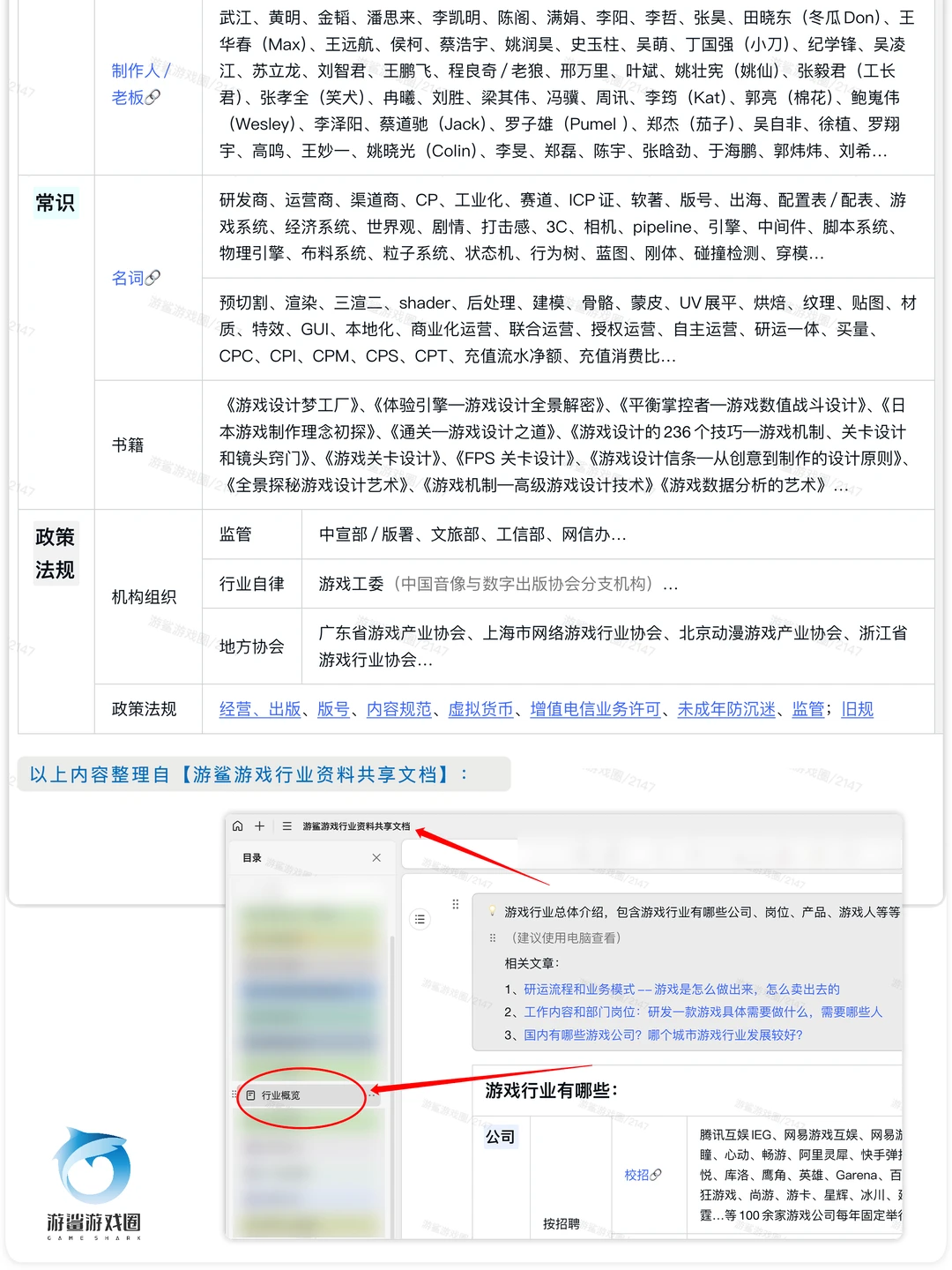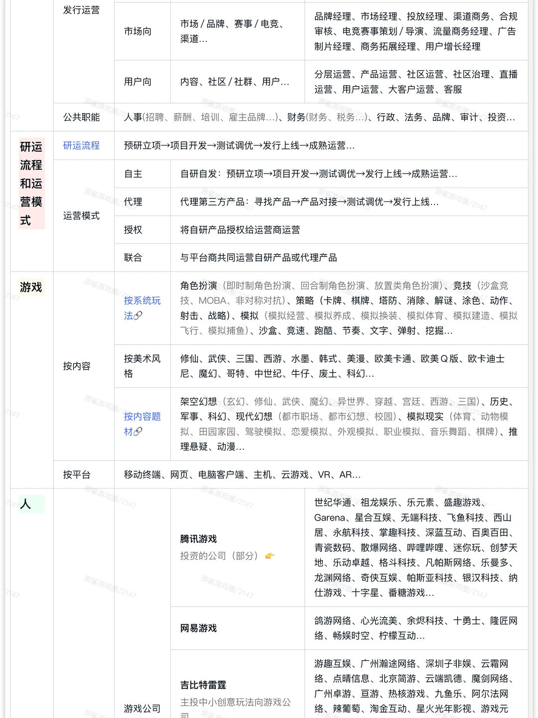 游戏行业按照上中下游可以分为研发、发行、渠道和其他。一般,一款游戏首先由研发公司开发,开发过程中(也可能开发前),发行商与研发公司签订发行合同,约定版权金和流水分成,获得发行授权。之后,发行商将游戏在各家渠道(应用商店等)发布,并通过广告和市场活动来推广游戏,最终收益按照一定的比例三方分成。 这其中会有一些其他相关公司从中获利,比如广告平台,IP授权商,美术、翻译、音乐、技术等解决方案供应商,x信、x宝等支付渠道公司,游戏直播平台,公会等等。