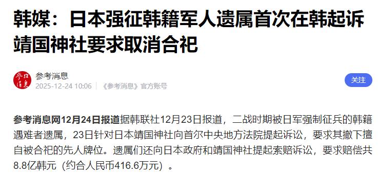 突发!靖国神社被起诉! 相信不少人都听说了,日本媒体之前就放出风来,现任首相高市早苗正琢磨着在12月26日去参拜靖国神社,可谁也没料到,还没等她付诸行动,靖国神社这边就先被人告上了法庭,而且告它的还是来自韩国的市民团体和战争受害者遗属。 据韩联社这些韩国媒体报道,当地时间12月23日,首尔中央地方法院迎来了一桩特殊的诉讼案,原告是10名二战时期被日军强制征兵的韩籍遇难者遗属,背后还有韩国民族问题研究所和太平洋战争受害者赔偿推进会这两个民间机构撑腰。 他们在当天专门开了记者会,把这事公之于众,核心诉求就两件事:一是要求靖国神社把擅自合祀在里面的先人参牌给撤了,从记载死者姓名和死亡日期的“祭神名簿”和“祭神名票”里彻底删掉祖辈的名字;二是向日本政府和靖国神社索赔8.8亿韩元,换算成人民币大概是420万元。 值得一提的是,这还是被日军强制征兵的韩籍遇难者遗属,头一回就取消靖国神社合祀的问题,在韩国本土的法院提起诉讼,之前他们都是跑到日本去打官司,这次算是换了个新战场。 可能有人会问,不就是个牌位吗?为啥这些遗属反应这么强烈?其实这里面的门道深了去了,对这些韩国家属来说,先人被合祀到靖国神社,根本不是什么单纯的宗教仪式,说白了就是把受害者塞进了日本美化侵略战争的叙事框架里,属于二次加害。 诉讼代理人团说得很明白,当年日本政府靠着武力强征韩国人去当炮灰,把他们推向战场导致遇难,现在又不经过遗属同意,偷偷把先人的个人信息提供给靖国神社搞合祀,这不仅是对逝者的不尊重,更直接侵犯了遗属的人格权、宗教信仰自由和良心自由。 毕竟靖国神社供奉的可不是什么普通亡灵,里面还藏着14名二战甲级战犯,像东条英机、松井石根这些双手沾满亚洲人民鲜血的刽子手都在里面,这地方早就成了日本军国主义的象征,把被强征的韩国受害者和这些战犯摆在一起祭祀,换谁家里人都接受不了。 要说这事儿的根源,还得追溯到日本殖民统治朝鲜半岛的那段黑暗历史。从1910年到1945年,日本在朝鲜半岛殖民了35年,二战期间为了弥补兵力不足,更是强行征调了40万朝鲜人充当炮灰,其中有15万人死在了战场上。 而日本方面压根没跟家属商量,就把其中2万多名韩籍死者的牌位塞进了靖国神社合祀,这事儿直到上世纪90年代才被曝光,一下子就激起了韩国民众的强烈愤怒。 从那以后,这些遗属就没停止过维权,2007年和2013年,他们两次跑到日本法院起诉,要求取消合祀,理由说得很充分:先人是被强征的受害者,不是自愿参战的,未经同意合祀就是二次伤害;而且靖国神社是日本神道教的地方,跟韩国的宗教信仰完全不一样,这简直是“盗窃灵魂”。 可让人窝火的是,日本法院两次都以“诉讼时效已过”为由,把这些遗属的诉求给驳回了,维权之路走得异常艰难。 更离谱的是,日本方面不光合祀不经过同意,连名单都搞得乱七八糟,之前还查出过“活死人”被供奉的荒唐事。韩国真相调查委员会就曾发现,有5位尚在人世的韩国老人,名字居然赫然出现在靖国神社的战死者名录里。 这次遗属们改到韩国法院起诉,其实也是吸取了之前的教训。之前韩国的强征慰安妇案和强征劳工案,日本方面一直拿1965年的《韩日请求权协定》当挡箭牌,说赔偿问题早就解决了,拒绝承担责任。 但后来韩国大法院在相关案件中都判决日本方面要负责赔偿,这让这些遗属看到了希望——既然在日本起诉胜诉难,那不如回到自己国家的法院,胜算可能更大。 而且现在的时机也很特殊,日本是高市早苗领导的极右翼政府执政,韩国则是左派的李在明政府掌权,两国在历史问题上的分歧本来就大,这次诉讼大概率会进一步影响韩日关系。 这次韩国遗属在首尔起诉,不管最终判决结果如何,不管执行起来会遇到多少阻力,至少让全世界再次看到了那段历史的真相,看到了受害者及其后代从未放弃的维权努力。 也希望日本政客能明白,历史从来都不是可以随便篡改和美化的,无视历史正义、伤害受害国家人民感情的行为,最终只会搬起石头砸自己的脚。 高市早苗要是真的明智,就该赶紧放弃那些不明智的参拜计划,正视历史才能真正改善和周边国家的关系,否则只会在错误的道路上越走越远。