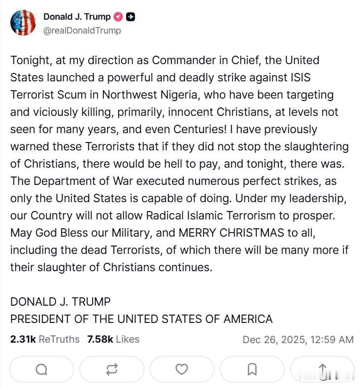 【特朗普下令空袭尼日利亚】 “今日傍晚,奉本人作为总司令之命,美军对盘踞在尼日利亚西北部、隶属于‘伊斯兰国西非省’的恐怖主义势力发动了猛烈致命打击。该组织屡次发动袭击、惨无人道地屠戮无辜平民,尤以基督徒为主要目标,其暴行之恶劣,可谓数十年乃至数百年罕见!” “我此前早已警告过这些恐怖分子:若他们不停止对基督徒的屠戮,必将付出惨痛代价——而就在今夜,他们已然血债血偿。 国防部执行了数轮精准打击,这般战力,唯有美国能够企及。 在我的领导之下,我国绝不允许激进伊斯兰恐怖主义滋生蔓延。 愿上帝保佑我们的军队,祝所有人圣诞快乐——也包括这些丧命的恐怖分子。倘若他们继续屠戮基督徒,此类亡命之徒只会越来越多。”