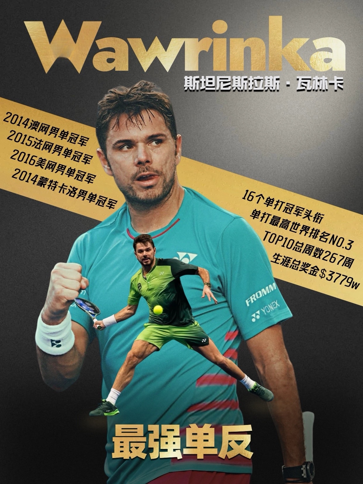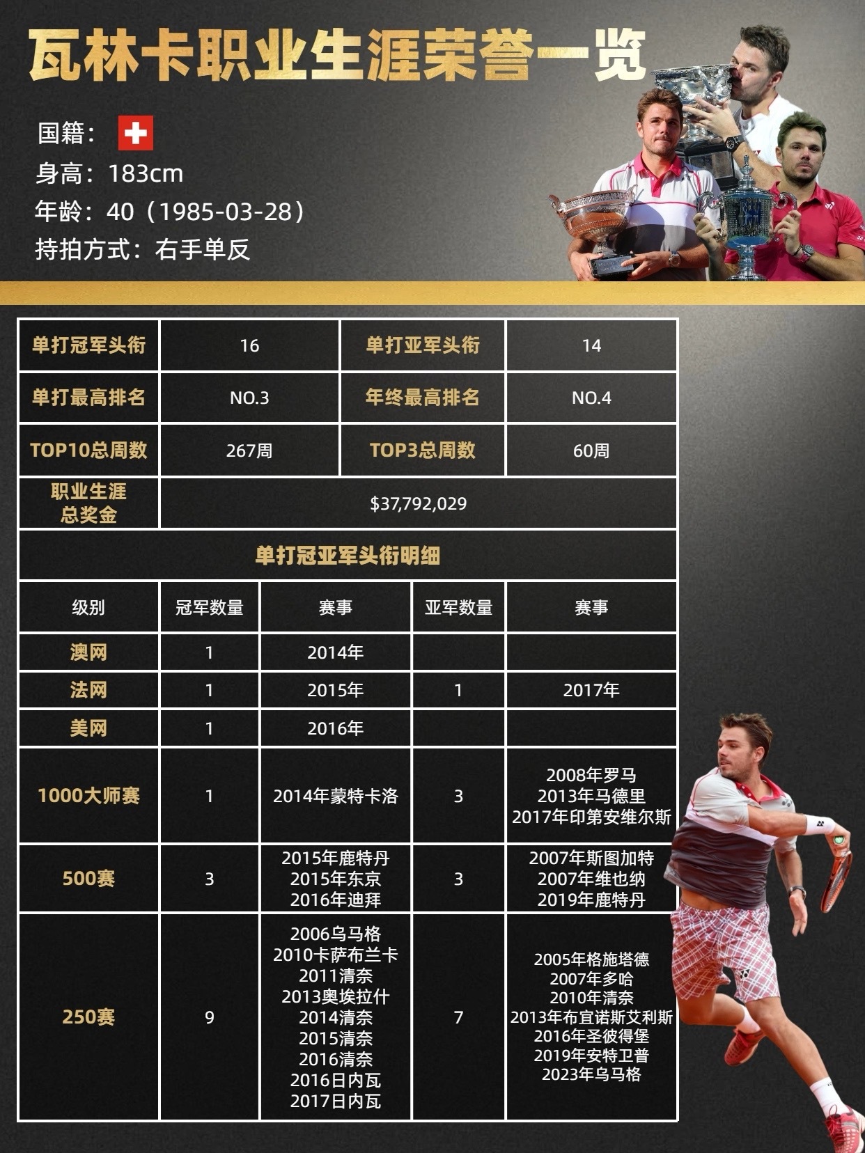 三届大满贯得主、最强暴力单反选手🇨🇭瓦林卡表示2026年将是自己最后一个赛季,届时将结束自己的网球生涯。40岁的瓦林卡作为暴力美学代表,曾是三巨头和穆雷之外的第五人,他曾收获三座大满贯冠军,用标志的暴力单反书写过属于自己的荣耀。瓦林卡职业生涯荣誉数据👇🏻⭐职业生涯最高排名:NO.3⭐TOP10总周数:267周⭐TOP3总周数:60周⭐职业生涯总奖金:$37,792,029⭐职业生涯冠军头衔:16个,包括:大满贯×31000大师赛×1500赛×3250赛×9🥇还曾搭档费德勒获得了北京奥运会男双金牌⭐职业生涯亚军头衔:14个,包括:大满贯×11000大师赛×3500赛×3250赛×7登上过巅峰,也曾跌入谷底,瓦林卡用四个词评价自己“坚持、牺牲、纪律、韧性”。网球的故事即将结束,但人生还有新开始,祝福斯坦·瓦林卡享受属于自己职业剩下的最后一舞,用潇洒的单反画下圆满的句号。