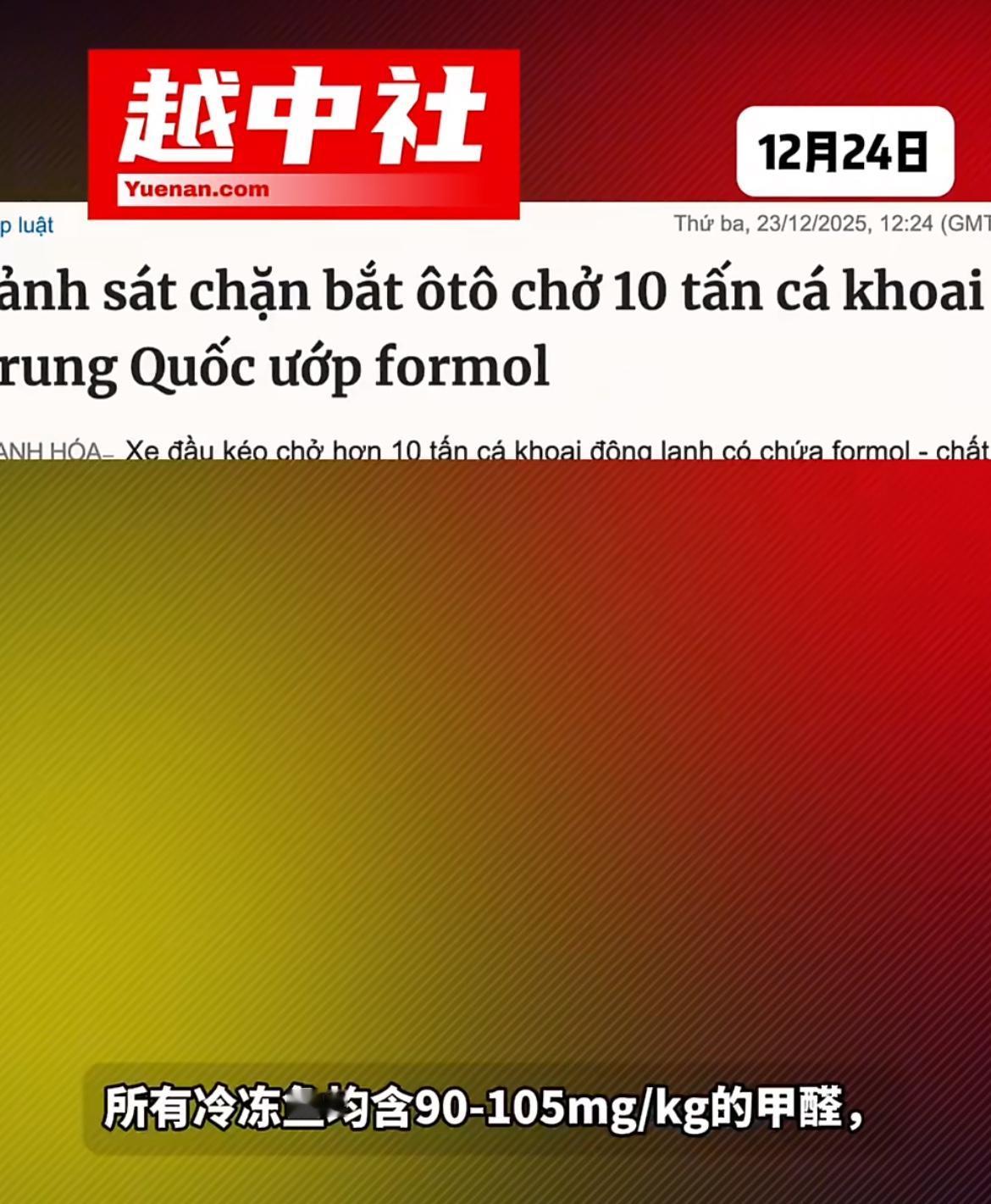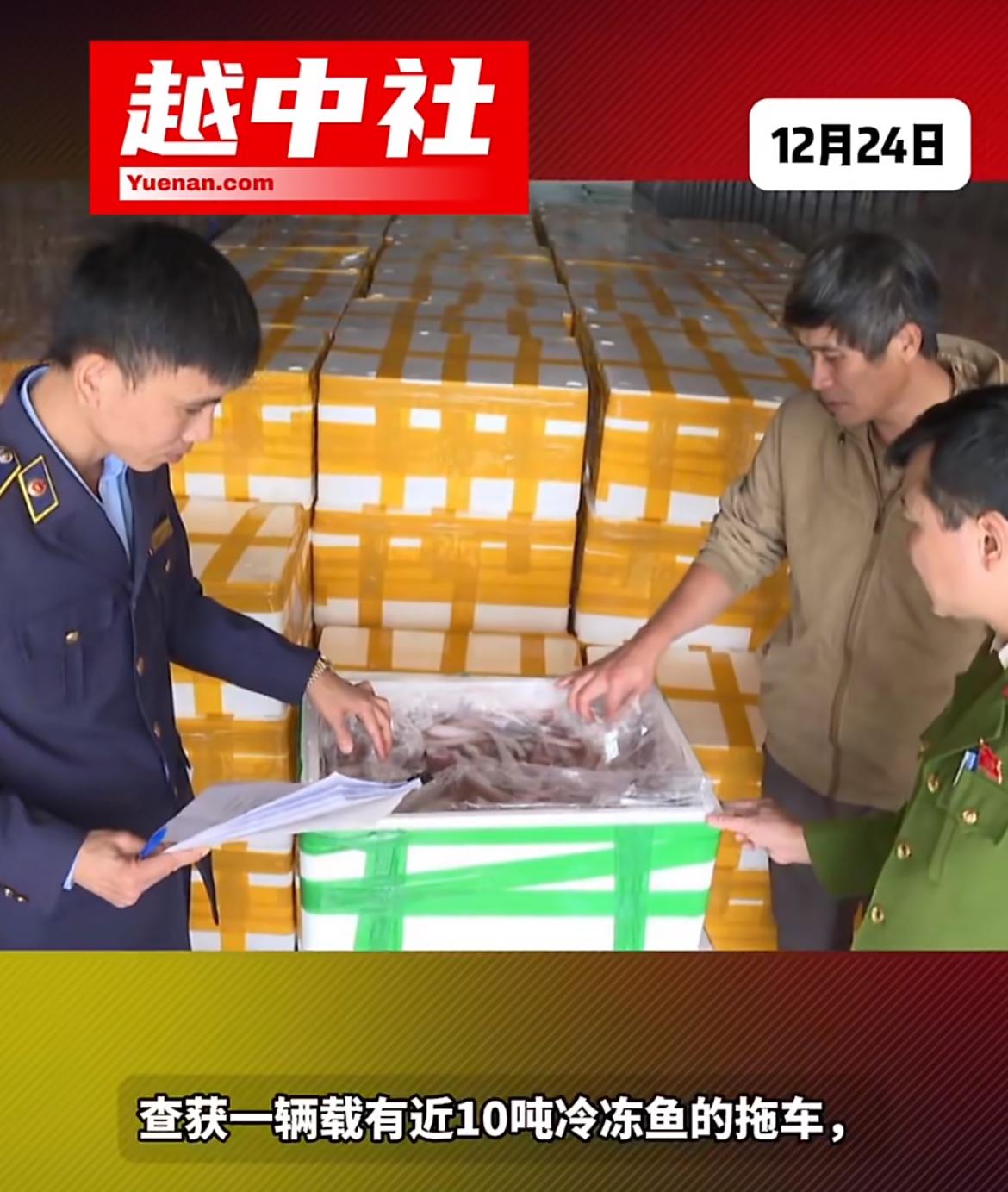 中国输送越南的10吨鱼发现甲醛超标,12月23日,越南清化警方查获一辆从中国凉山口岸进入的运鱼车被截获,检测发现,这些巴沙鱼甲醛严重超标,怀疑是被泡过甲醛。甲醛用作防腐剂,这是被明令禁止用在食品上的。没想到这些不法商人,竟然干这种不耻的事情,败坏中国出口商品的名声。目前还不清楚,是到底在越南泡的甲醛,还是国内泡好了再送过去的。甲醛危害检测 越南水产品出口 越南陆运冷链