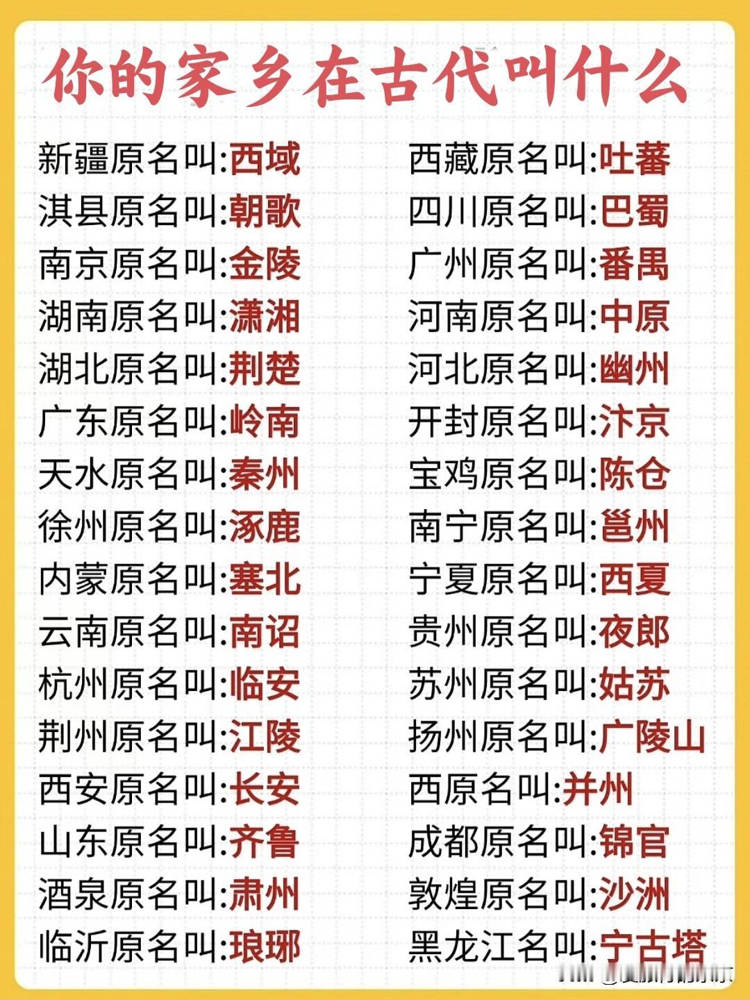 说起他们的原名,你想到了什么? 云南在古代叫~南诏 临沂在古代叫~琅琊 敦煌在古代叫~沙洲 湖南在古代叫~潇湘 南京在古代叫~金陵 新疆在古代叫~西域 宁夏在古代叫~西夏 河北在古代叫~幽州 ...... 在图中找到你的家乡了吗? 你的家乡在古代叫什么名字? 地名 姑苏