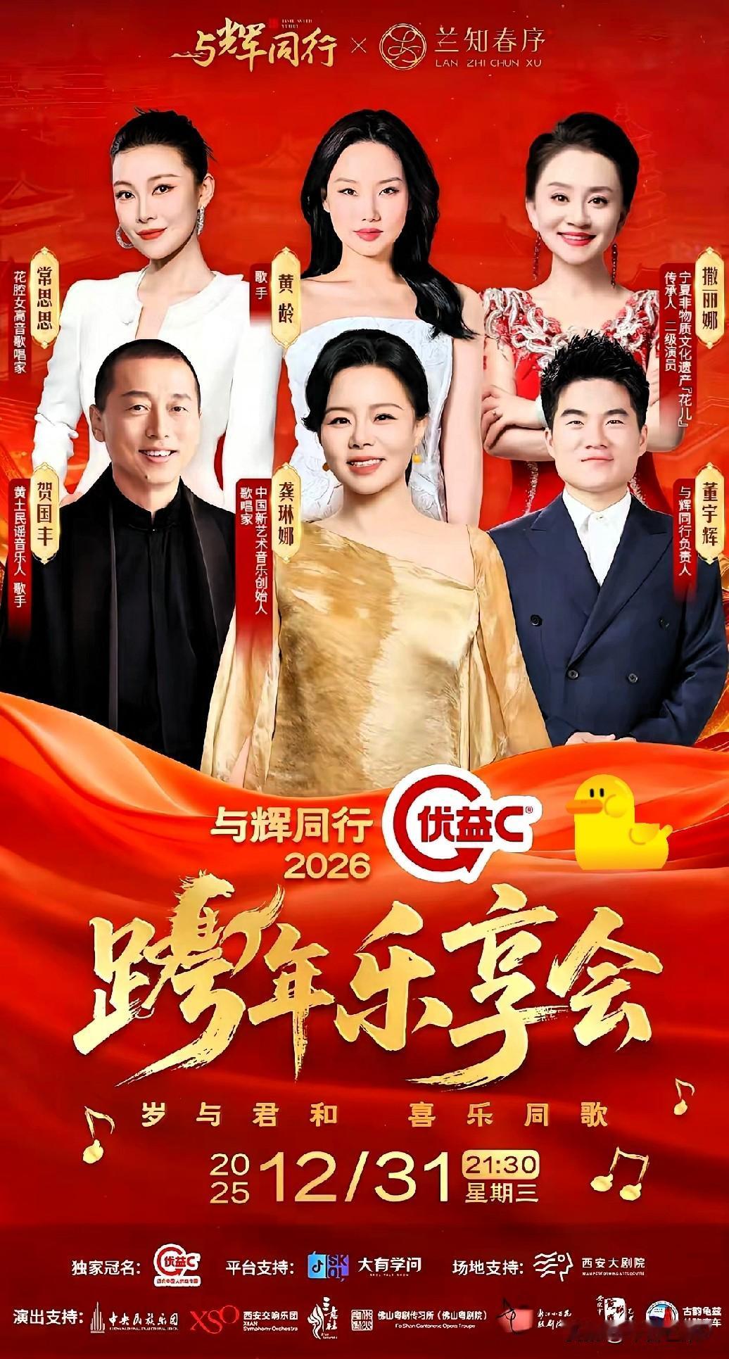 "与辉同行"2026跨年乐享会出席嘉宾正式官宣了! 一共五位嘉宾,最让我没想到的是龚琳娜。 ​今天,"与辉同行"跨年音乐会嘉宾正式官宣,终于尘埃落定,他们是——龚琳娜,贺国丰,黄龄,常思思,撒丽娜。 龚琳娜的加盟确实让人眼前一亮。这位中国新艺术音乐创始人,从《忐忑》到《小河淌水》,她的声音总能打破常规,在传统与现代之间找到完美平衡。她不仅唱功了得,更是一位文化传承者,多年来深入民间采风,将中国声乐艺术推向世界舞台。 贺国丰这个名字可能有些人不太熟悉,但提起"黄土民谣",他就是这个概念的提出者。这位来自陕西绥德的音乐人,几乎走遍了陕北的沟沟壑壑,把那些散落在民间的歌曲重新整理、组合和演唱。他的歌声里有黄土地的质感,也有现代音乐的细腻与张力。 黄龄,那个唱《痒》和《High歌》的"挠痒痒歌手"。她的声音像丝绸划过瓷器,慵懒中带着妩媚,妖娆中藏着真诚。从运动员到歌手,她的人生轨迹本身就充满故事性。她的音乐总能挠到人心最柔软的地方。 常思思,新民族声乐的代表人物。她打破了传统民歌的刻板印象,将花腔技巧与民族旋律巧妙融合。《春天的芭蕾》《玛依拉变奏曲》这些作品,让中国民歌在新时代焕发出年轻活力。她的歌声清亮灵动,既有爆发力又不失细腻。 撒丽娜,这位来自草原的歌手,用她独特的嗓音诠释着草原儿女的豪情与柔情。她的歌声里,有风吹草低的辽阔,也有马头琴的悠扬。 这场跨年乐享会定档12月31日至2026年1月1日,在西安高新区西安大剧院举办。由西安交响乐团有限公司承办,130名专业演职人员将带来高规格古典乐盛宴。最让人惊喜的是,乐享会为防黄牛不售票,锁定直播间免费看,这波宠粉操作太实在了! 这五位嘉宾,风格各异却又相得益彰。龚琳娜的先锋探索、贺国丰的黄土情怀、黄龄的慵懒妩媚、常思思的新民族声乐、撒丽娜的草原风情,他们将在西安这座古城碰撞出怎样的火花?想想就让人期待。 跨年夜的西安大剧院,注定要成为一场音乐的盛宴。这五位嘉宾,每一位都是各自领域的佼佼者,他们的同台,不仅是一场视听享受,更是一次文化的交融与传承。
