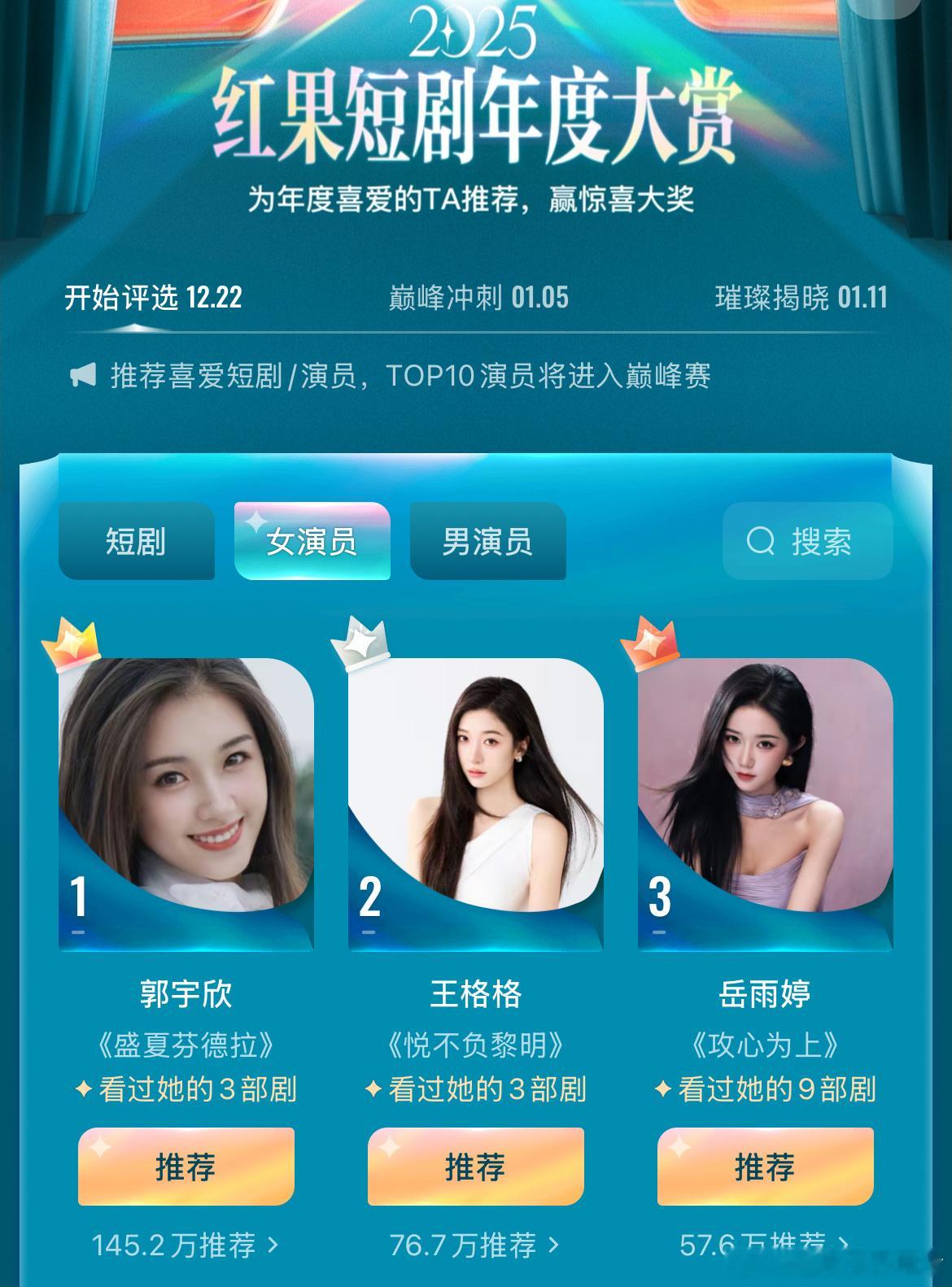 目前红果短剧年度大赏前三名分别是男演员:刘萧旭、陈添祥、马小宇女演员:郭宇欣、王格格、岳雨婷