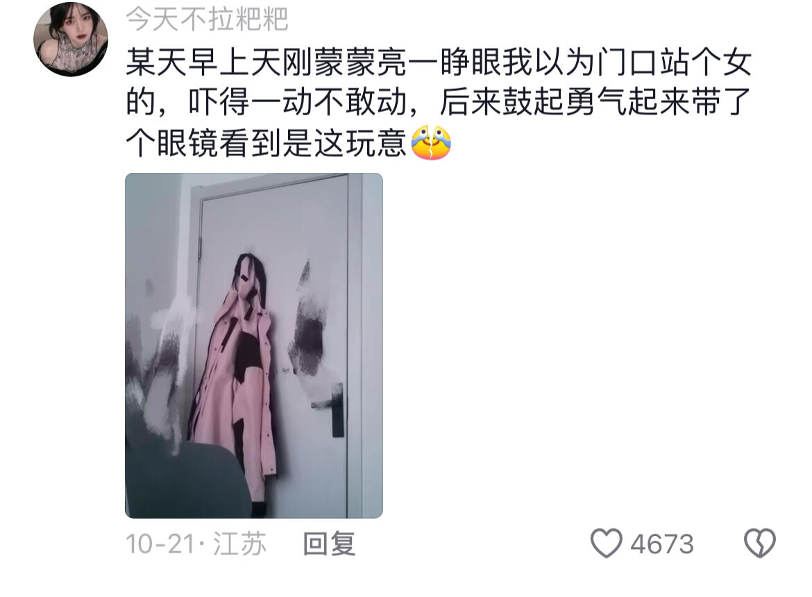 某天早上天刚蒙蒙亮,一睁眼我以为门口站个女的,吓得一动不敢动,后来鼓起勇气起来带了个眼镜,看到是这玩意