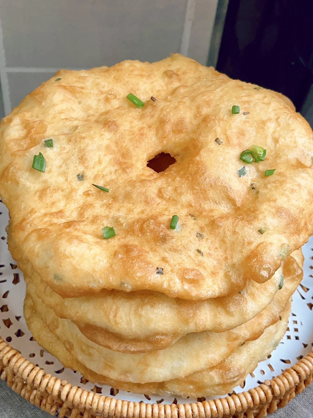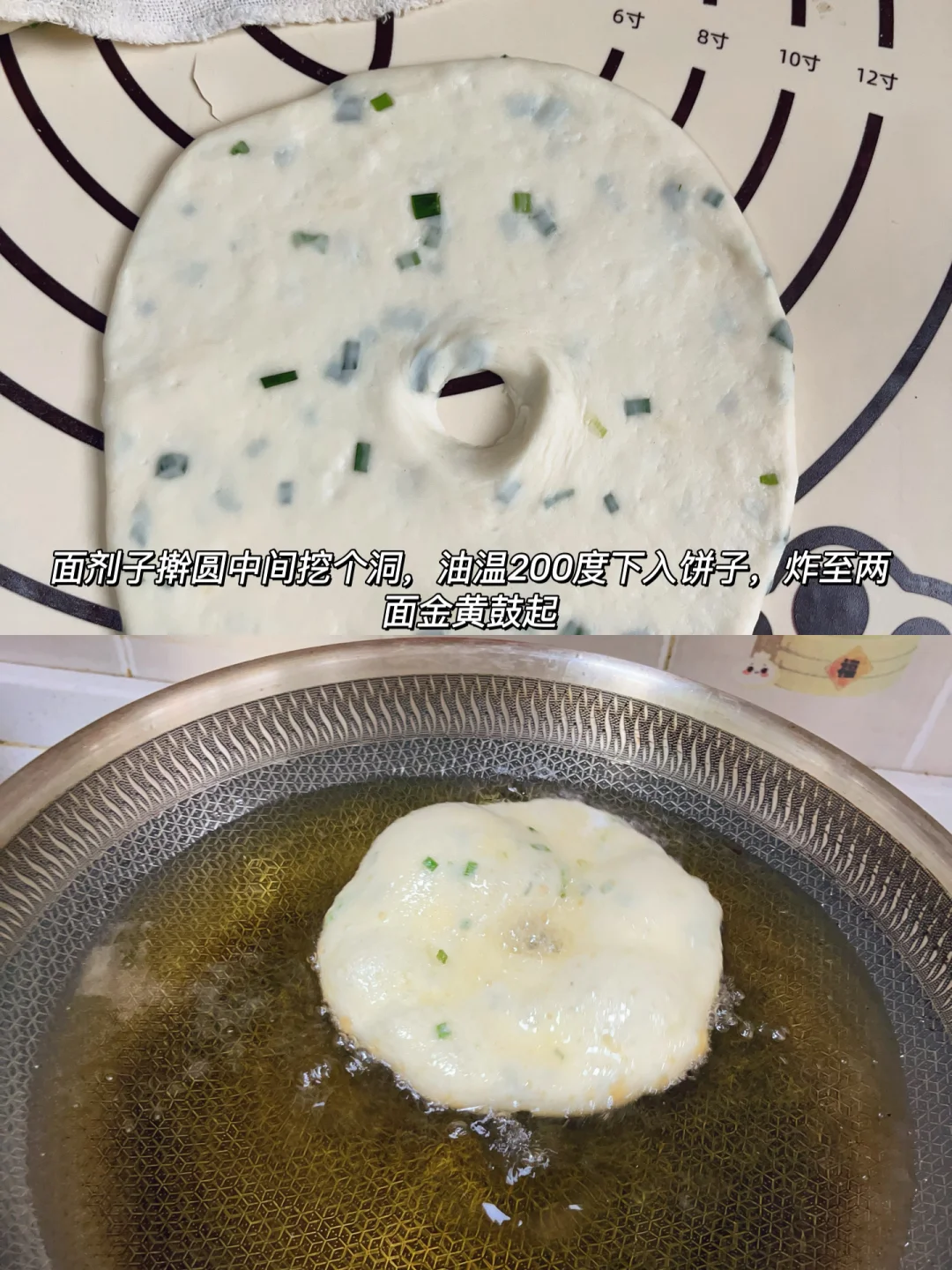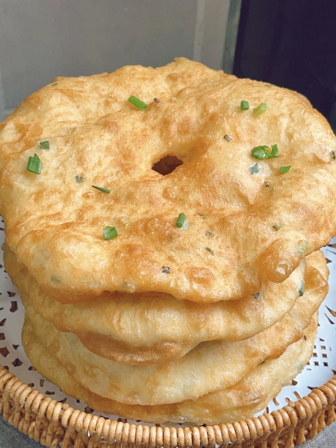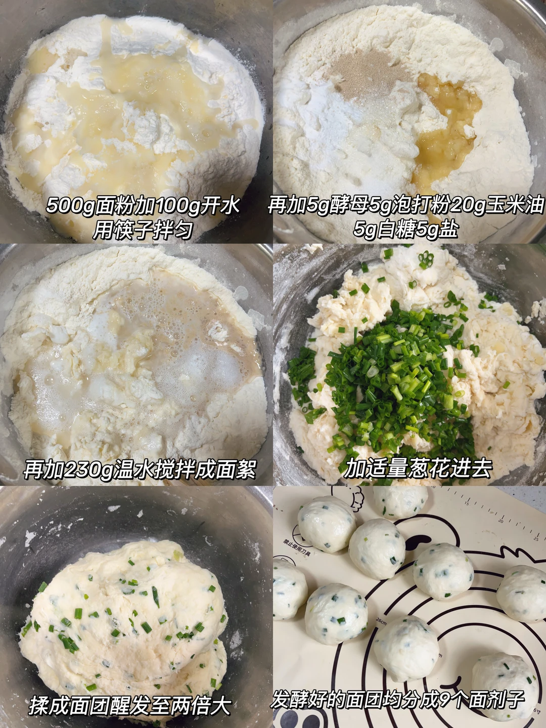 太香了,无比好吃的葱油饼一定要试试,才出锅外酥里软,放凉之后就是软软的 [清单R]食材 500g面粉、100g开水、5g酵母、5g泡打粉、5g白糖、5g盐、230g温水、20g玉米油、葱花适量 [清单R]步骤 1⃣️500g面粉中先倒入100g开水用筷子搅拌均匀,然后加入酵母泡打粉白糖盐玉米油拌匀,最后加230g温水搅拌成面絮,加入适量葱花揉成面团 2⃣️揉好的面团醒发至两倍大,醒发好的面团轻柔排气,均分成9份揉成小圆球 3⃣️面剂子擀圆中间戳个洞,油温200度放入锅中炸至两面金黄鼓起