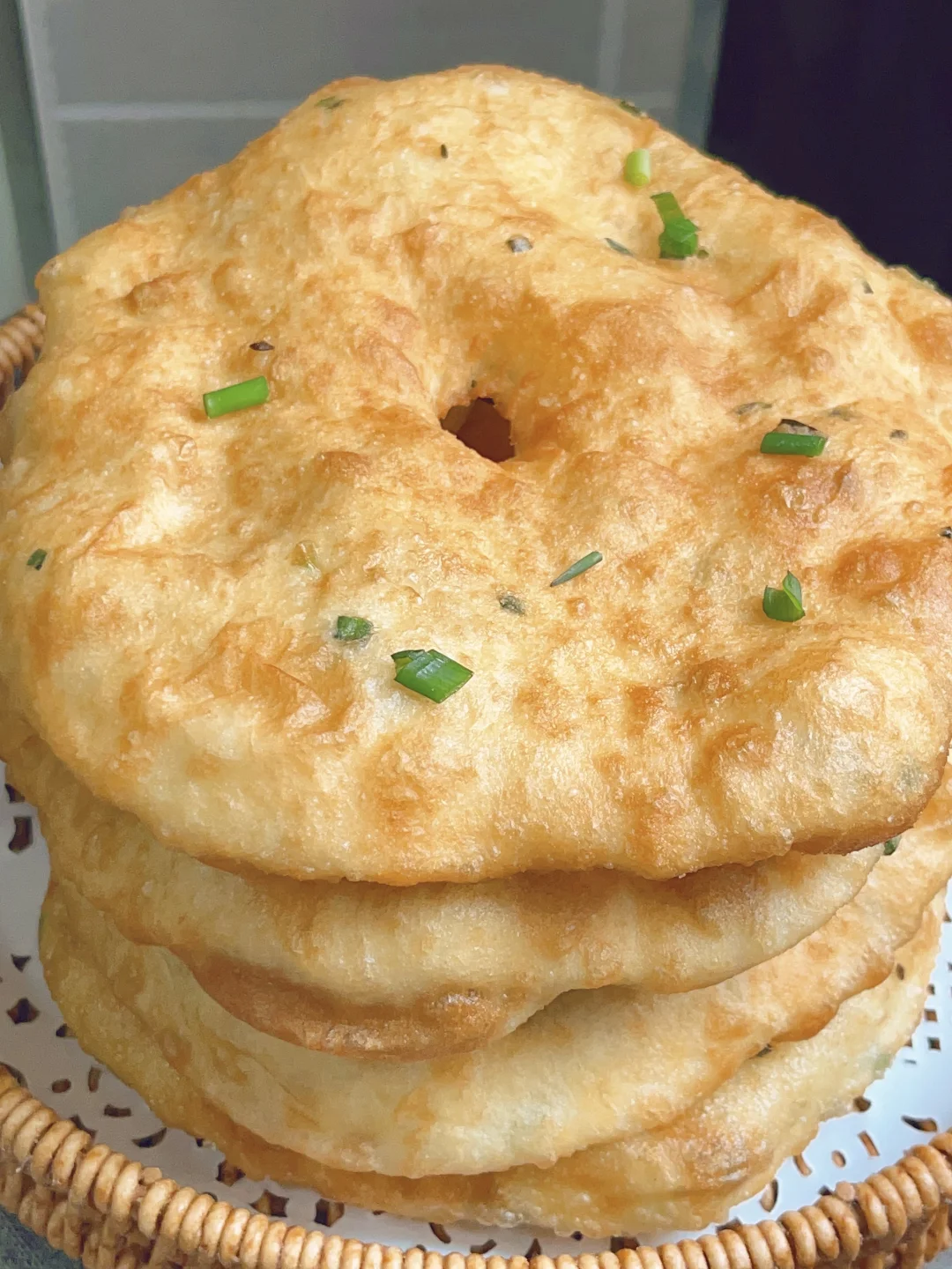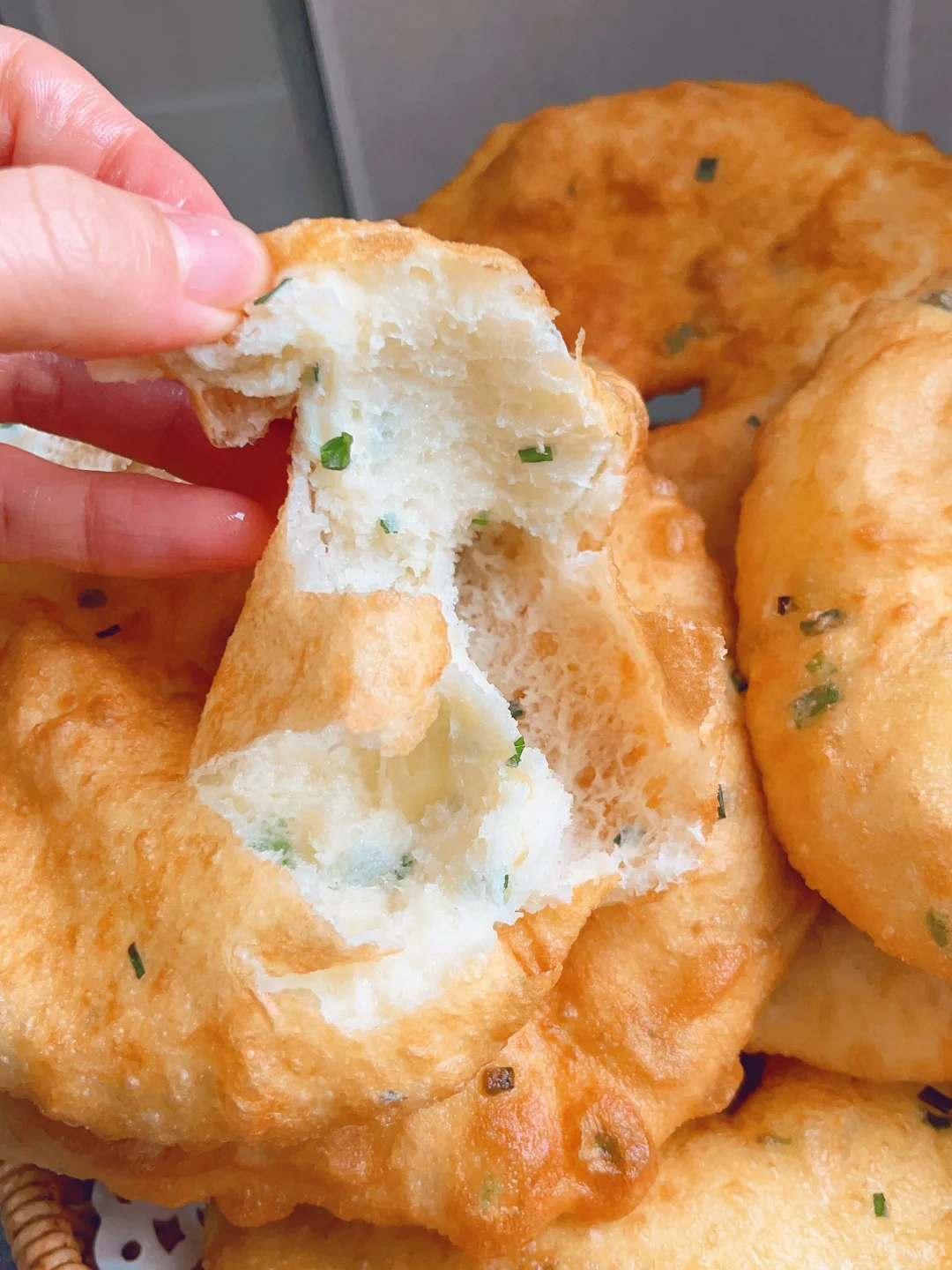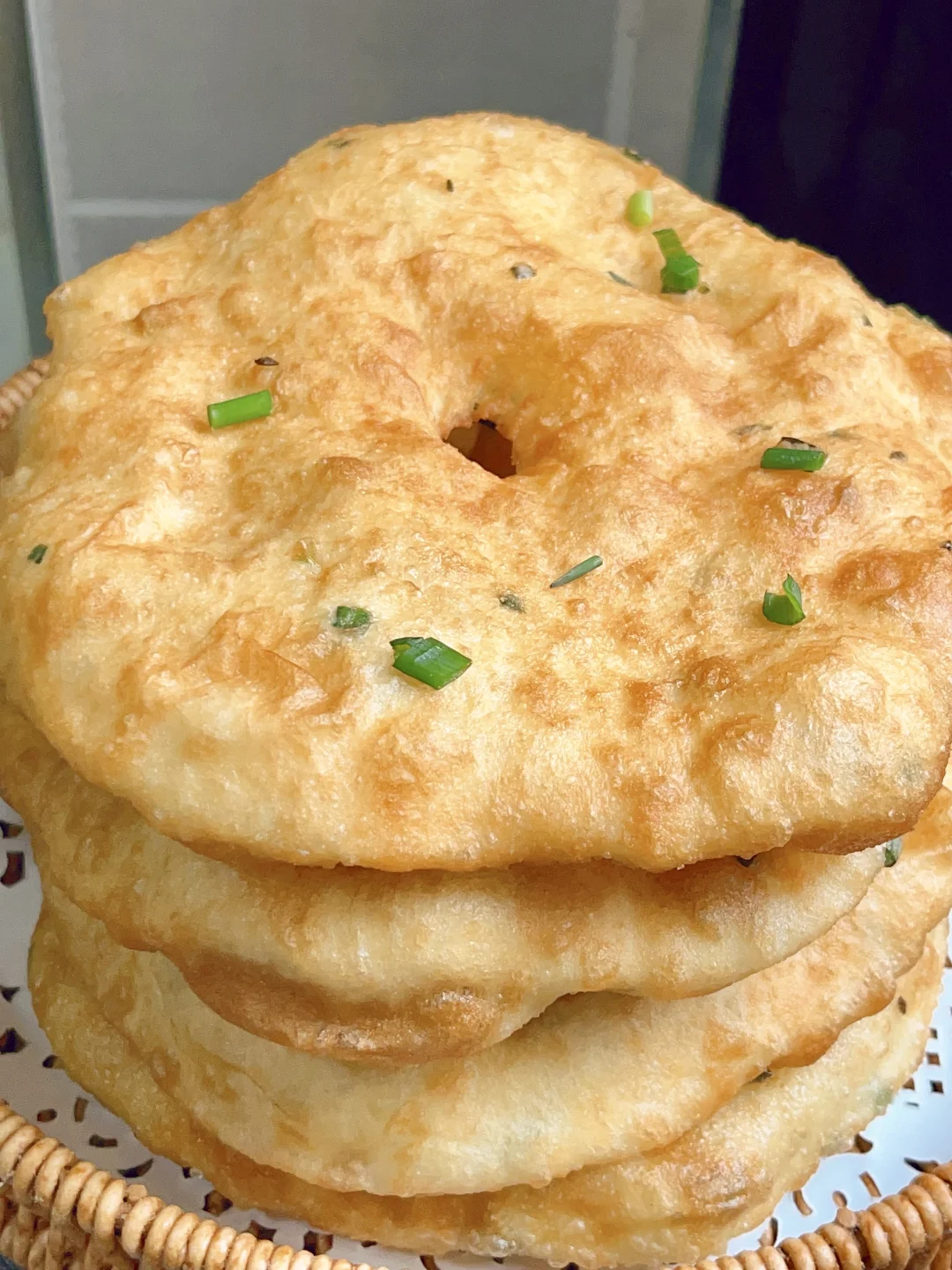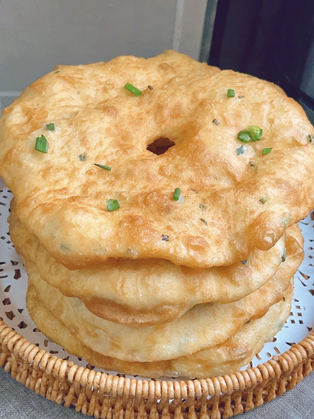太香了,无比好吃的葱油饼一定要试试,才出锅外酥里软,放凉之后就是软软的 [清单R]食材 500g面粉、100g开水、5g酵母、5g泡打粉、5g白糖、5g盐、230g温水、20g玉米油、葱花适量 [清单R]步骤 1⃣️500g面粉中先倒入100g开水用筷子搅拌均匀,然后加入酵母泡打粉白糖盐玉米油拌匀,最后加230g温水搅拌成面絮,加入适量葱花揉成面团 2⃣️揉好的面团醒发至两倍大,醒发好的面团轻柔排气,均分成9份揉成小圆球 3⃣️面剂子擀圆中间戳个洞,油温200度放入锅中炸至两面金黄鼓起