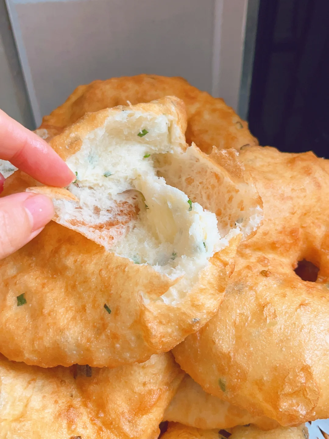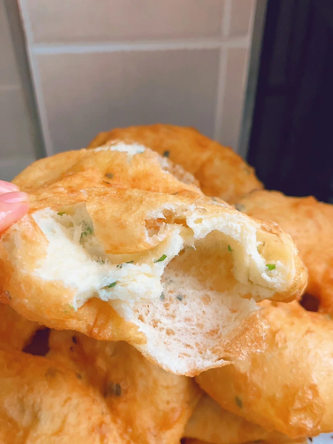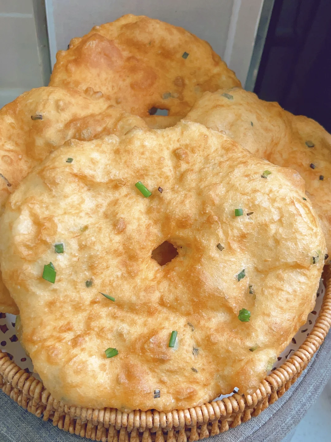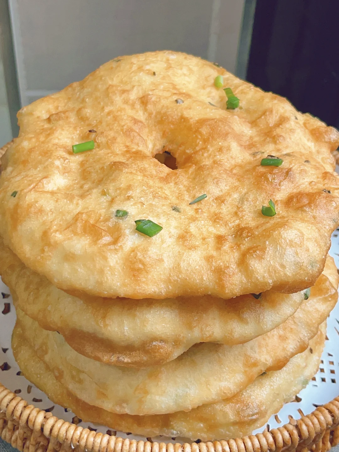 太香了,无比好吃的葱油饼一定要试试,才出锅外酥里软,放凉之后就是软软的 [清单R]食材 500g面粉、100g开水、5g酵母、5g泡打粉、5g白糖、5g盐、230g温水、20g玉米油、葱花适量 [清单R]步骤 1⃣️500g面粉中先倒入100g开水用筷子搅拌均匀,然后加入酵母泡打粉白糖盐玉米油拌匀,最后加230g温水搅拌成面絮,加入适量葱花揉成面团 2⃣️揉好的面团醒发至两倍大,醒发好的面团轻柔排气,均分成9份揉成小圆球 3⃣️面剂子擀圆中间戳个洞,油温200度放入锅中炸至两面金黄鼓起