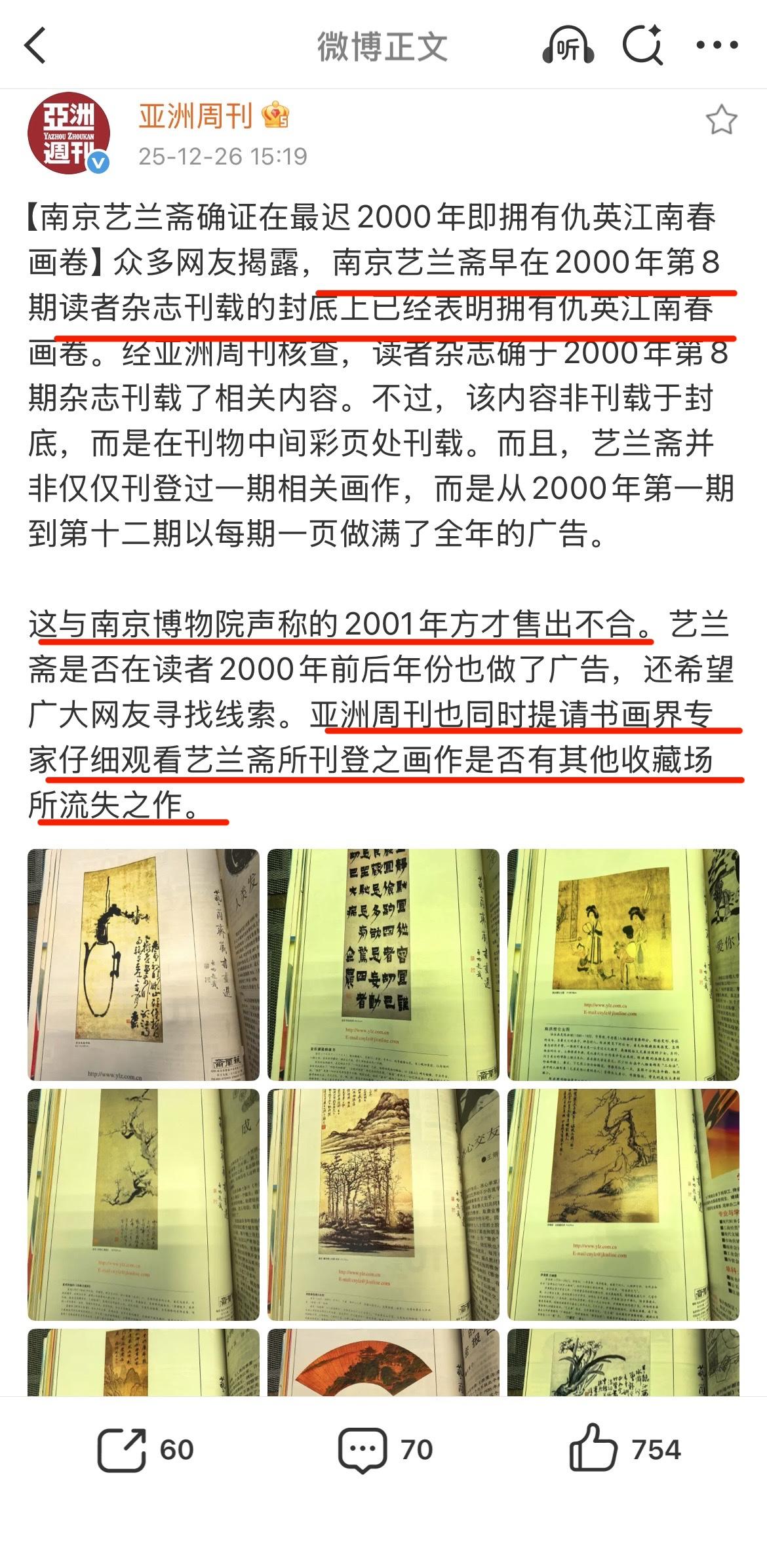 南博撒谎了?港媒尖锐质疑:“南京艺兰斋确证在最迟2000年即拥有仇英江南春画卷。” “经亚洲周刊核查,读者杂志确于2000年第8期杂志刊载了相关内容。” “这与南京博物院声称的2001年方才售出不合。” 看来,真的要发动群众“大找茬”了。 目前来看,港媒亚洲周刊的报道不温不火,好似处于限流状态,全靠网民转发。