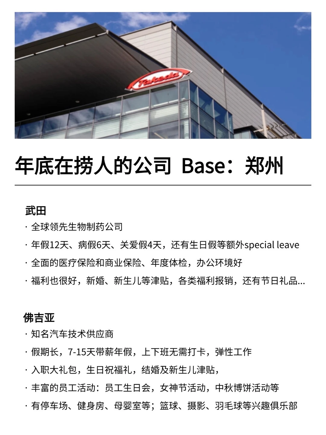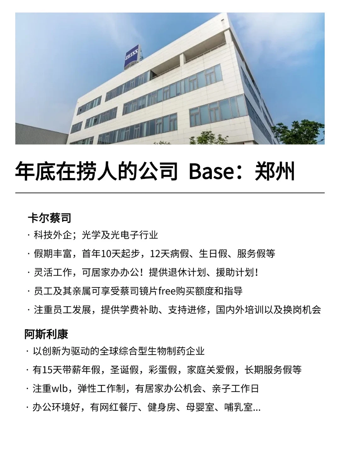 郑州发展真的越来越好,有不少小而美、冷门宝藏的公司,机会是真的很多的! 特别是有不少小众冷门的外企,真心建议大家可以去试试 · 为什么还是值得去外企? ▪️氛围好,对女性友好,年假长,基本上都是10天起步 ▪️很多还都支持居家办公、福利完善,是真的能实现WLB ▪️待遇也还不错,想在年底找工作的真的可以考虑考虑~ · 坚持日更✊🏻,帮大家在找工作路上顺利拿 offer! ·