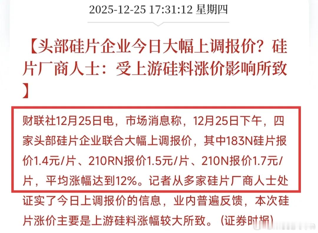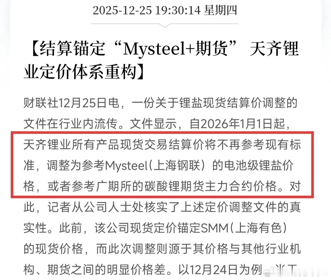 今天锂矿、光伏全线上涨!咱们分别来聊一下,非常重要。天齐锂业公告:将放弃上海有色网(SMM)的价格,转向上海钢联或广期所期货价格报价。这是啥意思?首先,SMM采用企业自愿上报的模式收集数据,价格准确性存疑。比如12月24号当天,碳酸锂LC2601合约的结算价为12.1万元/吨,而SMM上的市场均价,只有10.15万元/吨,二者相差近2万元。所以天齐作为锂矿龙头企业,想要拥有定价权、话语权,就必须打破旧秩序,提升对金融工具的运用能力,成为一名“规则制定者”,以便在价格博弈战中,占据更有利的位置。今天碳酸锂加权价格,突破13万元/吨,创23年11月以来新高,效果显著。其次,裕能、万润等磷酸铁锂企业,均发布设备检修公告:裕能将因此减产15-35%,万润预计减产15%-55%。这么做,可以解决铁锂企业的两个困境:1. 加工费低,投资回报率不合理。2. 借着天齐转换定价锚的契机,联手减产、制造供给缺口,可以为26年的加工费谈判,增加筹码。光伏方面,四家头部硅片企业,联合大幅上调报价,平均涨幅达到12%,主要系上游硅料涨价所致。这表明“反内卷”政策,已经开始产生实际效果。因为光伏的需求尚未复苏,硅片环节普遍亏损在30%左右,而头部企业敢于在此时联合涨价,从打价格战“求生存”,转向“保利润”,主动退出恶性循环,说明“反内卷”开始正式走向落地。此次硅片涨价,不仅仅是简单的成本传导,也是观察反内卷成色的试金石:现在上游企业敢于向下游传导成本,但下游企业是否接受?如果能接受,那就说明光伏行业的反内卷,取得了初步成功,那其他行业,比如化工、家电等,也有望出现反转机会。当然,目前这一块,仍然存在不确定性。