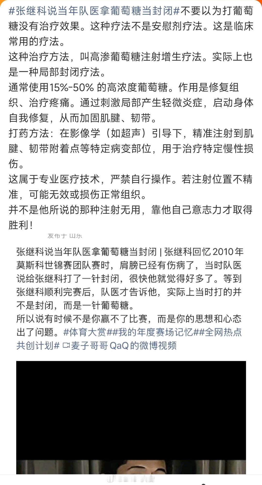 张继科说当年队医拿葡萄糖当封闭有人说这种治疗方式不是安慰剂查了一下,打葡萄糖的确是正常的临床疗法