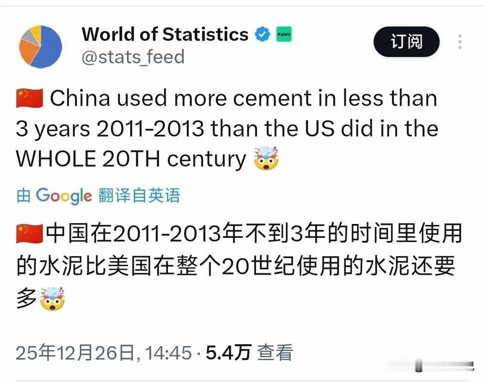 世界统计“中国三年的水泥用量超过美国20世纪的总和” 世界统计杂志近期在社交媒体发文称“中国2011年至2013年的水泥使用量超过了美国20世纪水泥使用量的总和”,然而水泥使用量只是中美之间的一个缩影。 中国用70年的时间走完了西方从文艺复兴到工业革命再到现代化建设的路程,而西方这条路用了几百年。